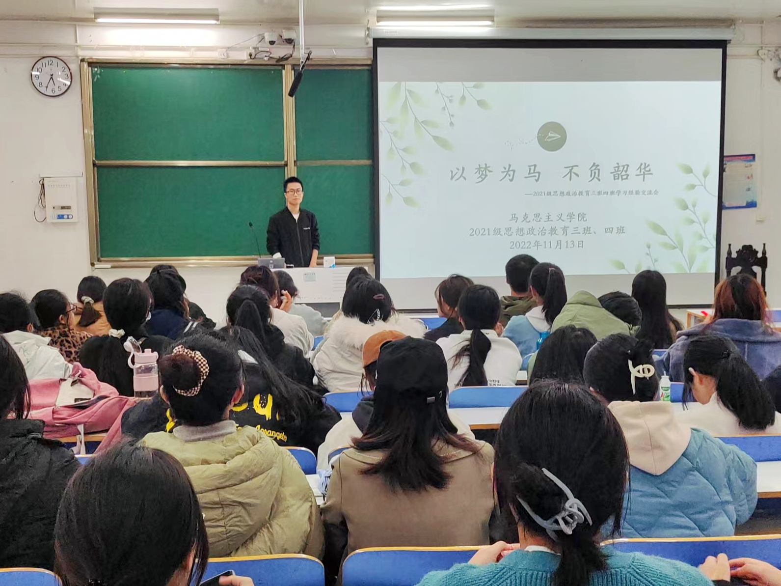11月13日下午,beat365在线唯一官网2021级思想政治教育三班、四班在社科楼514召开“以梦为马,不负韶华”学习经验交流会。beat365在线唯一官网2021级思想政治教育三班全体成员以及2020级思想政治教育一班申畅畅、2020级思想政治教育二班岳子怡参与此次会议。会议由学习委员于坤鹏主持。