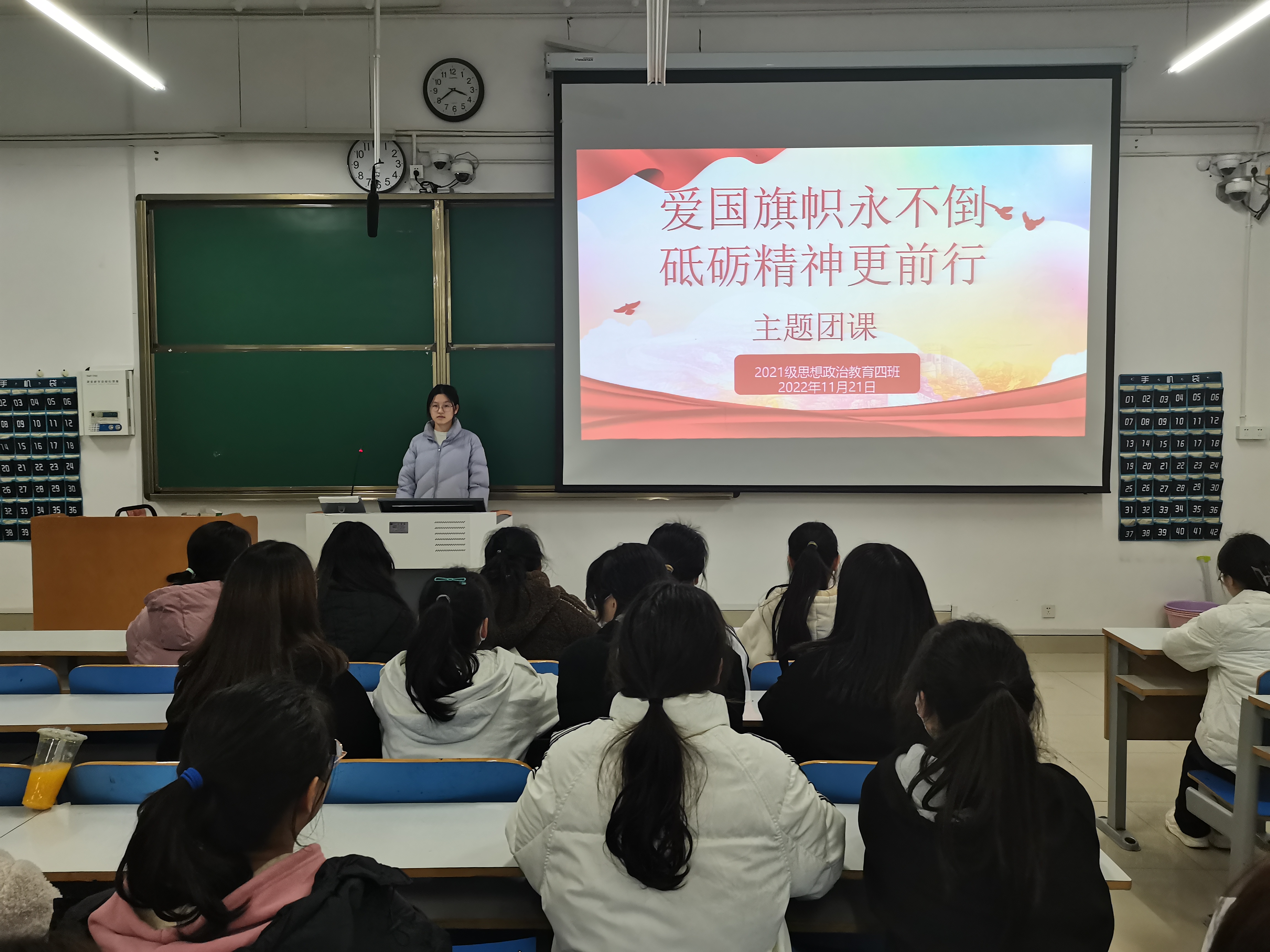 11月21日下午,beat365在线唯一官网2021级思想政治教育四班在社科楼514教室开展“爱国旗帜永不倒,砥砺精神更前行”主题团课。2021级思想政治教育四班全体学生共同参加本次团课。团课由团支书刘珂含主持。