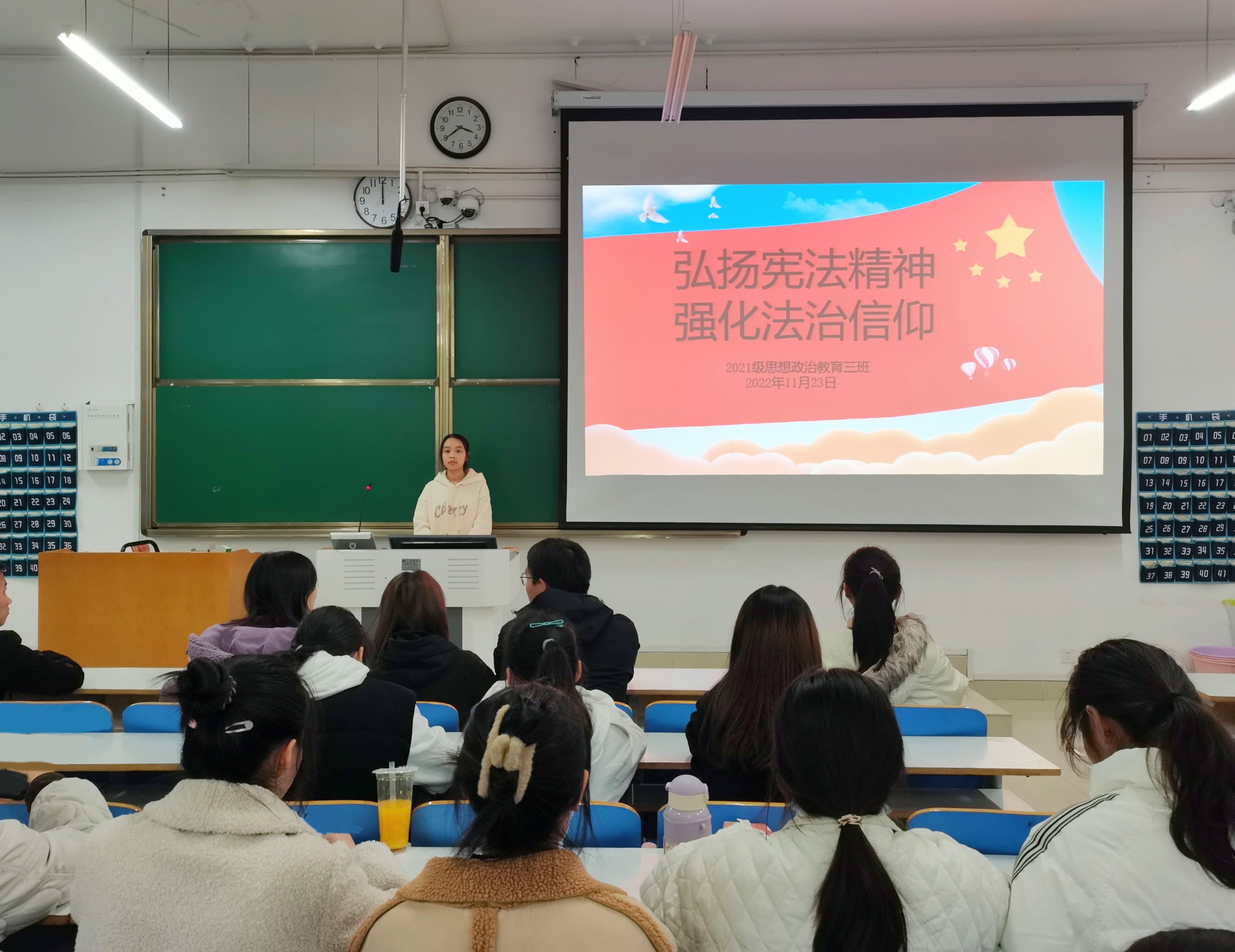 11月23日下午,beat365在线唯一官网2021级思想政治教育三班在社科楼416召开“弘扬宪法精神,强化法治信仰”主题团课。beat365在线唯一官网2021级思想政治教育三班全体团员参与此次会议。团课由团支书王岚霄主持。