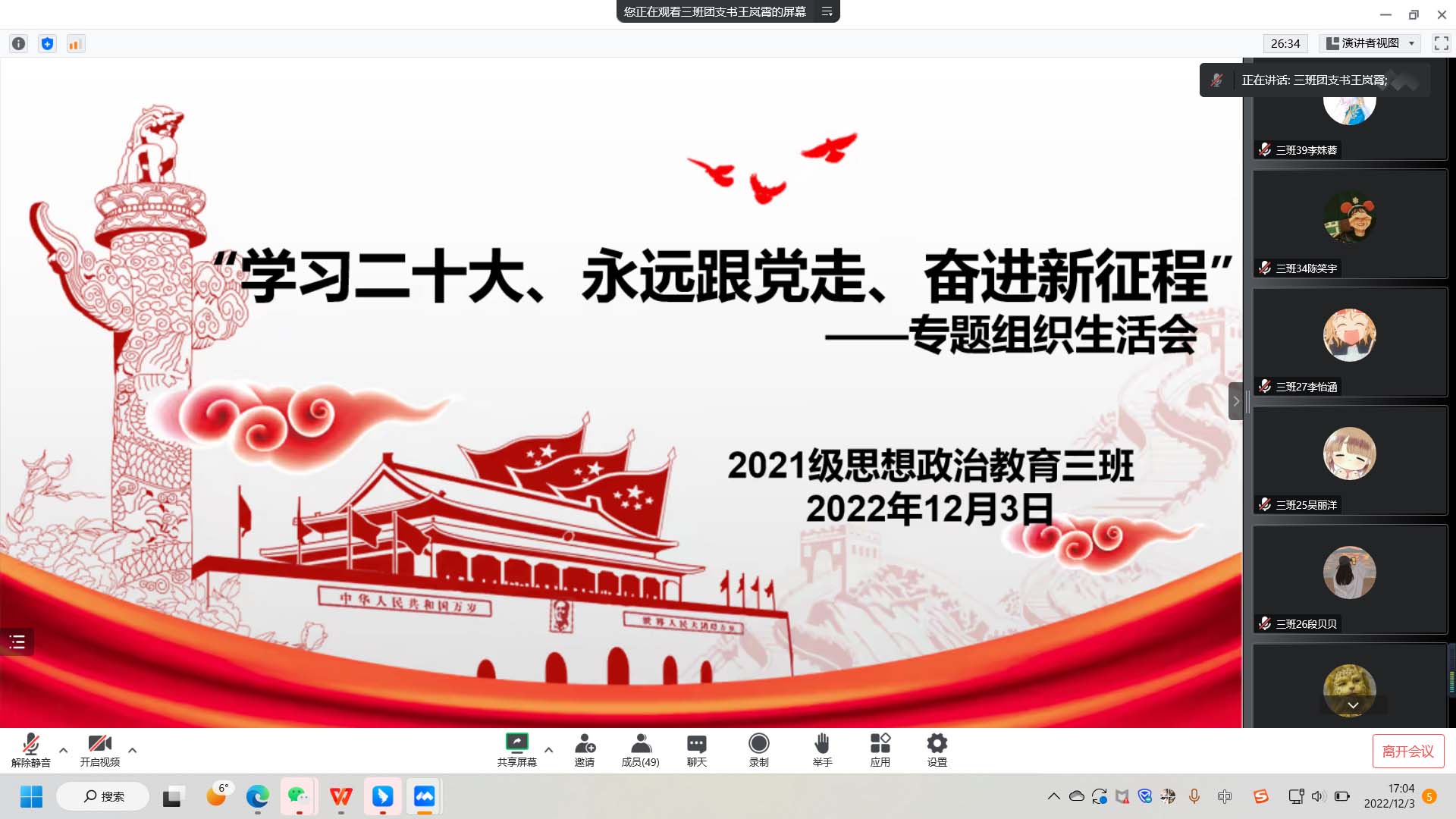 12月3日下午,beat365在线唯一官网2021级思想政治教育三班在线上召开“学习二十大、永远跟党走、奋进新征程”组织生活会。beat365在线唯一官网2021级思想政治教育三班全体成员参与此次会议。会议由团支书王岚霄主持。