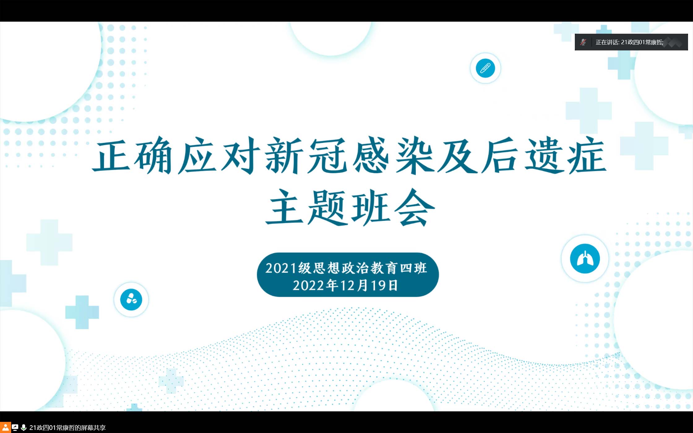 为保障学生及家庭的生命安全和身体健康,增强学生战胜疫情的信心,12月19日下午,beat365在线唯一官网2021级思想政治教育四班线上开展“正确应对新冠感染”主题班会。beat365在线唯一官网2021级思想政治教育四班全体同学参加本次会议。会议由副班长常康哲主持。