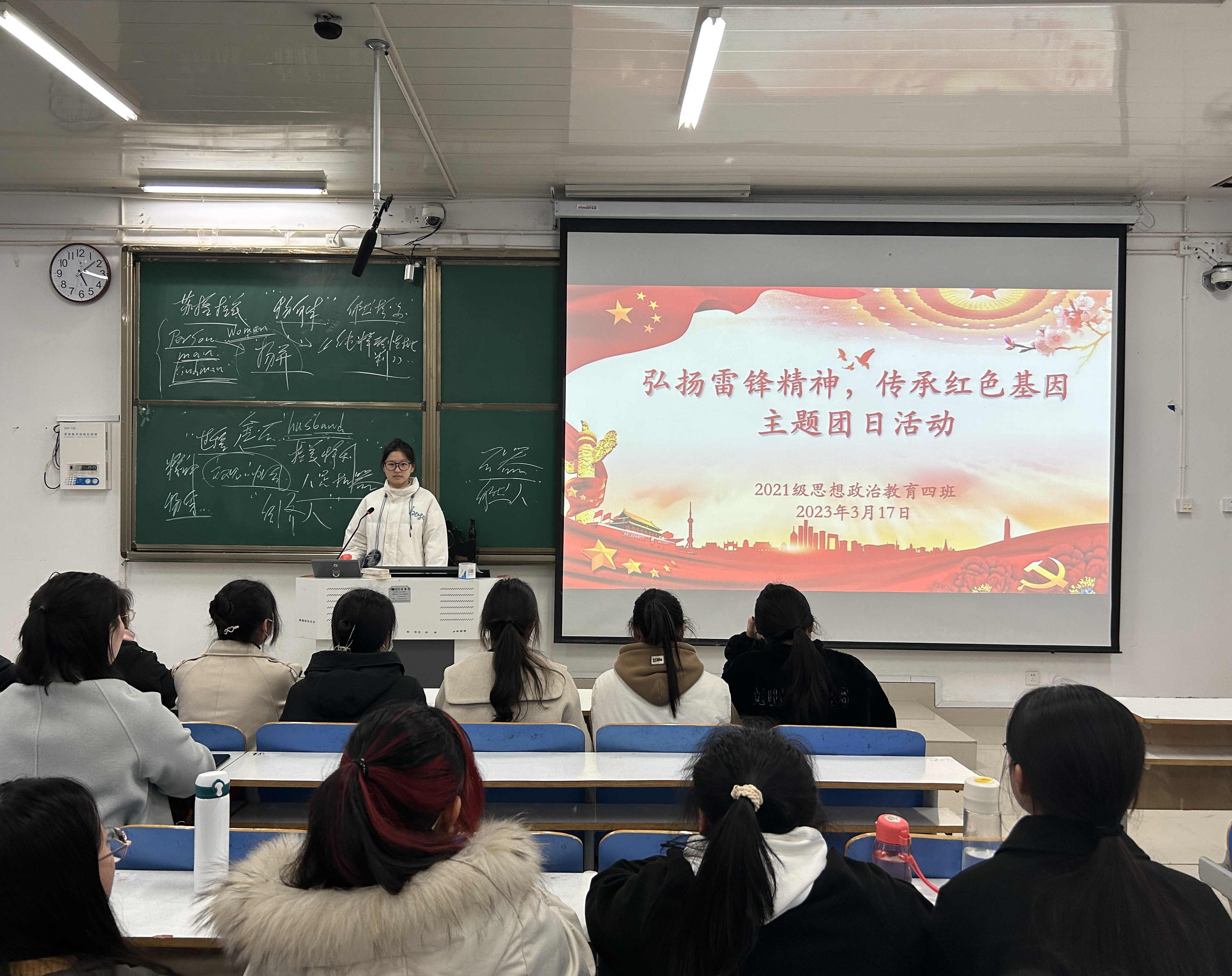 为大力弘扬雷锋精神,传承雷锋艰苦朴素的优良作风,3月17日下午,beat365在线唯一官网2021级思想政治教育四班在社科楼514教室开展“弘扬雷锋精神,传承红色基因”主题团日活动。2021级思想政治教育四班全体成员共同参加本次活动,活动由团支书刘珂含主持。