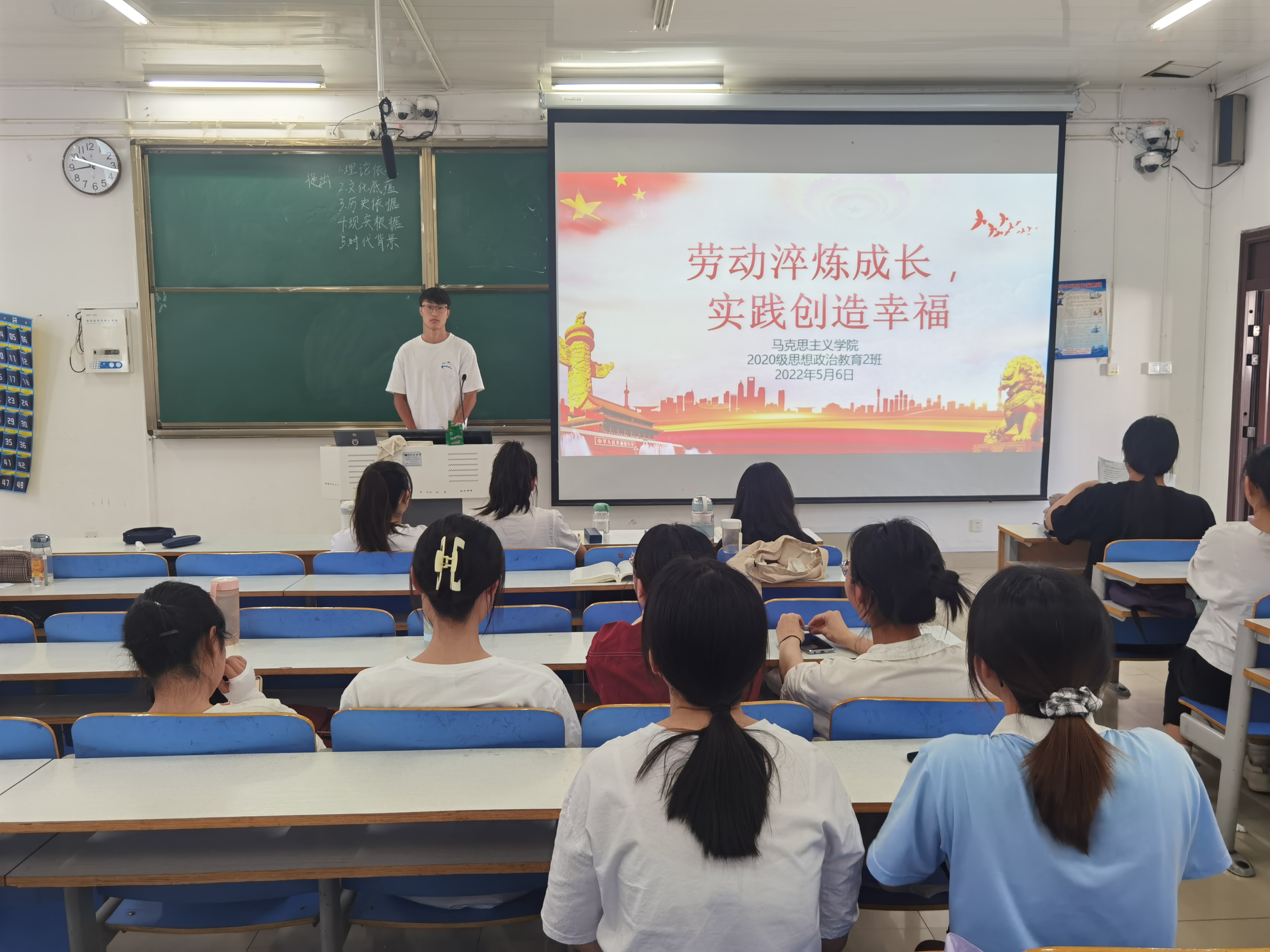 为进一步加强劳动教育,提高同学们的劳动意识,5月6日下午,beat365在线唯一官网2020级思想政治教育二班、定向二班在社科楼514教室开展“劳动淬炼成长,实践创造未来”主题班会。2020级思想政治教育二班、定向二班全体成员参与本次班会。班会由班长陈宇航主持。