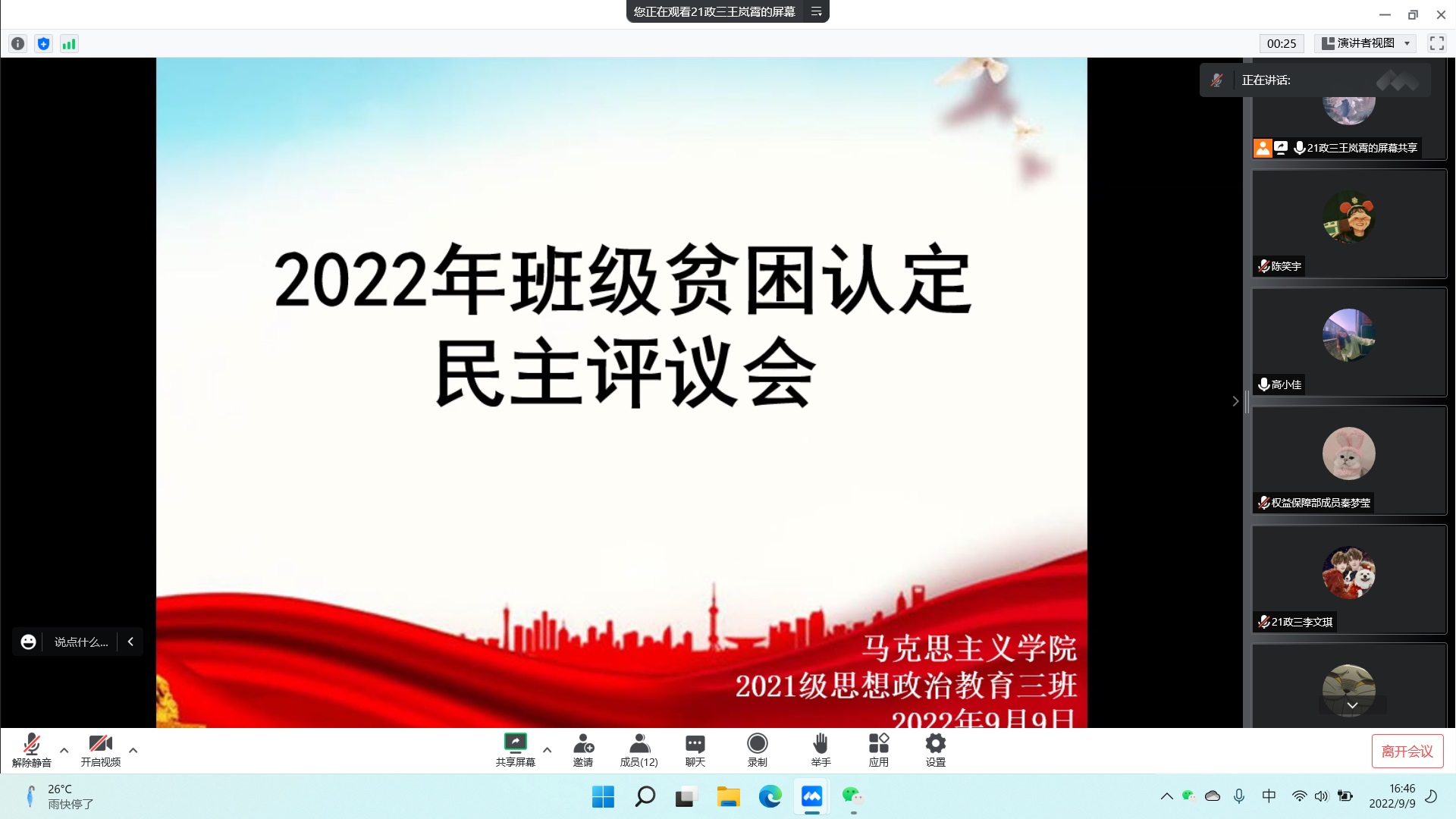 9月9日下午,beat365在线唯一官网2021级思想政治教育三班召开线上2022年班级贫困认定民主评议会。2021级思想政治教育三班贫困认定委员团全体成员以及权益保障部秦梦莹、宣传委员陈笑宇参与此次会议。会议由团支书王岚霄主持。