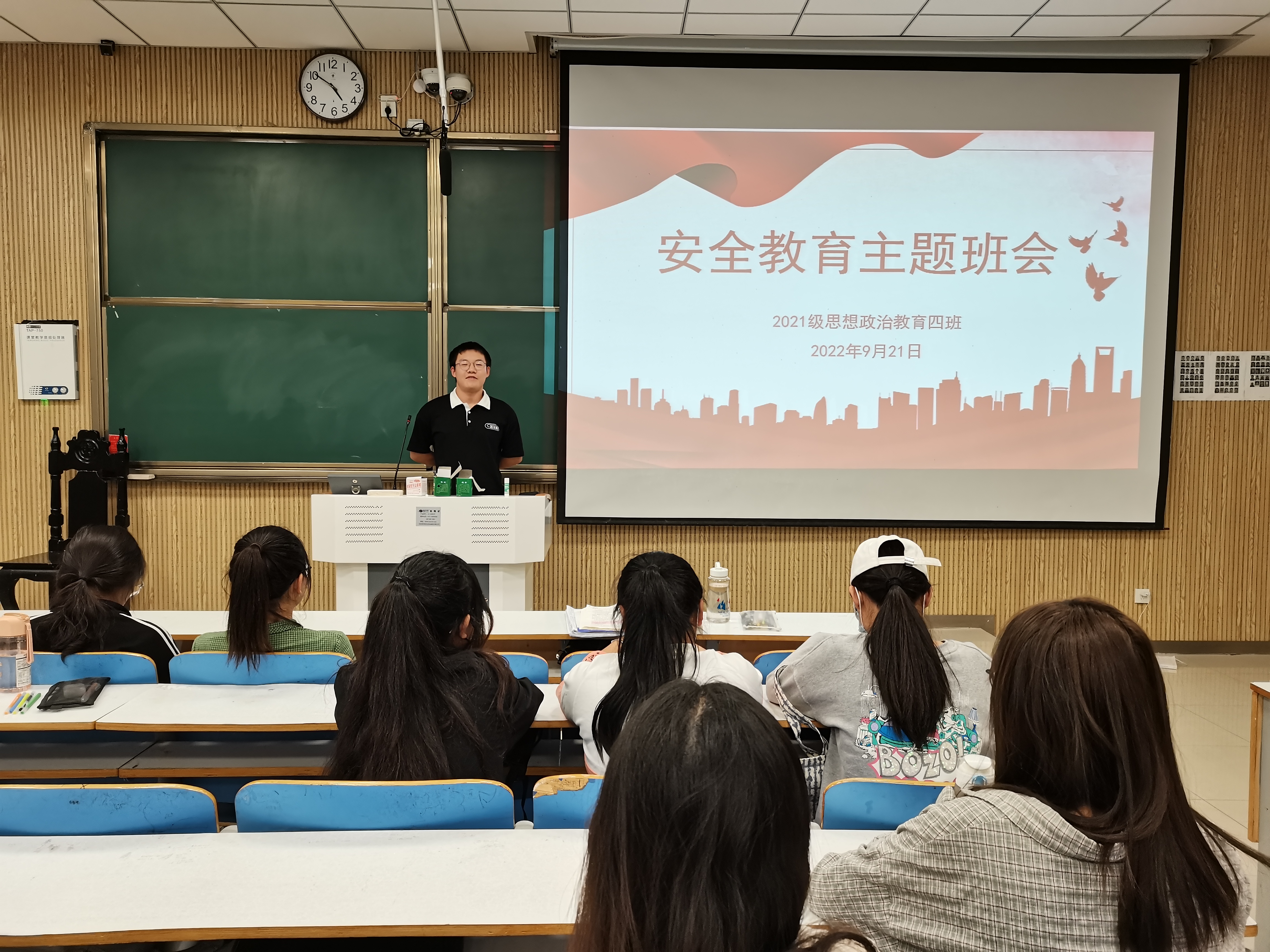 9月21日下午,beat365在线唯一官网2021级思想政治教育四班在社科楼515教室开展安全教育主题班会。2021级思想政治教育四班全体同学共同参会。班会由副班长常康哲主