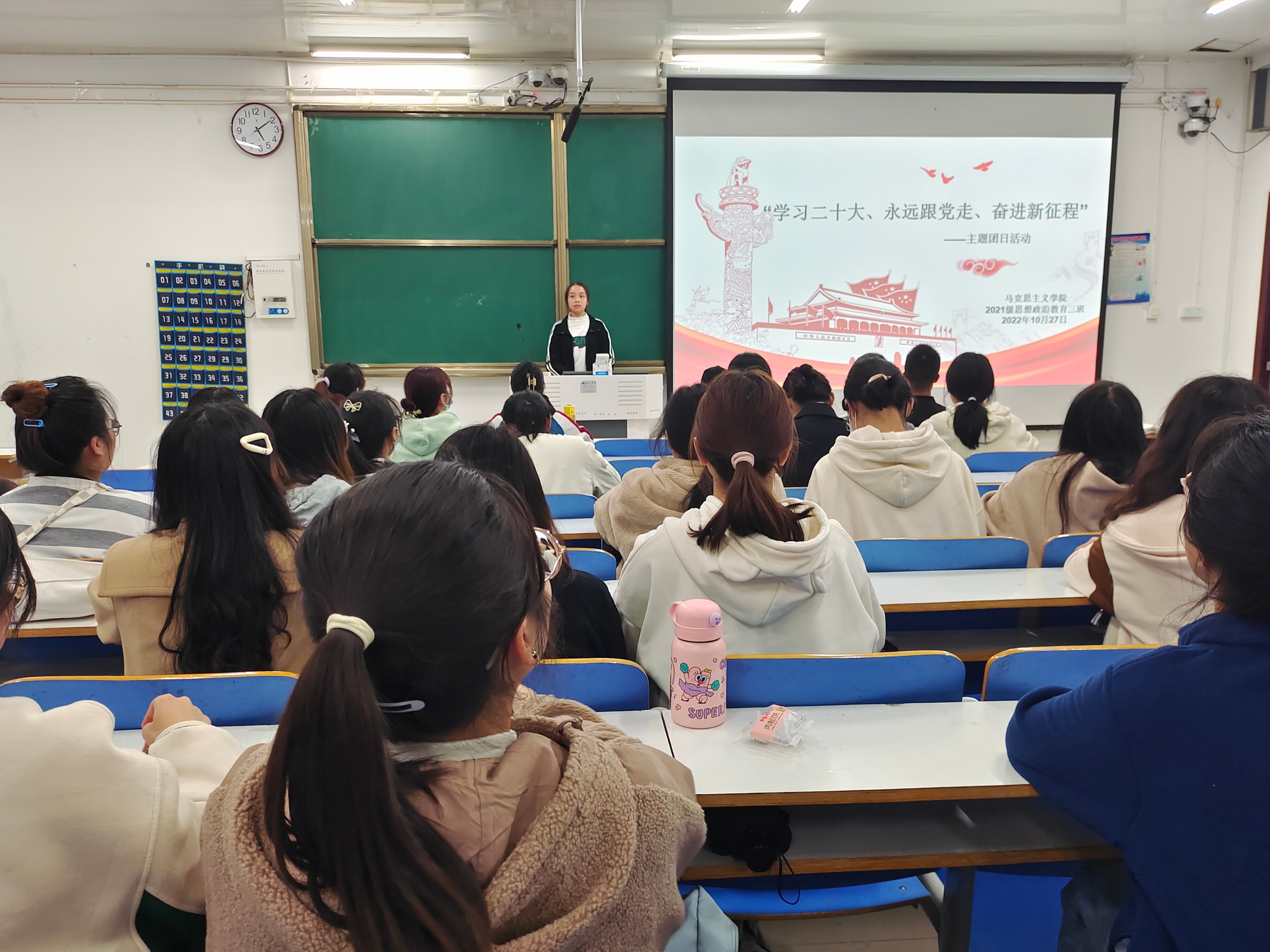 团课伊始,组织委员秦梦莹对参会人员进行清点。随后,王岚霄指出,中国共产党第二十次全国代表大会是在全党全国各族人民迈上全面建设社会主义现代化国家新征程、向第二个百年奋斗目标进军的关键时刻召开的一次十分重要的大会。接着,王岚霄带领大家观看学习了学习强国中有关二十大的系列视频,研读了习近平总书记在二十大上所作的报告,多方位了解并学习了二十大精神。随后,5位团员代表就本次团课学习感悟进行发言。最后,王岚霄对本次活动进行总结,团课在同学们的掌声中拉上帷幕。