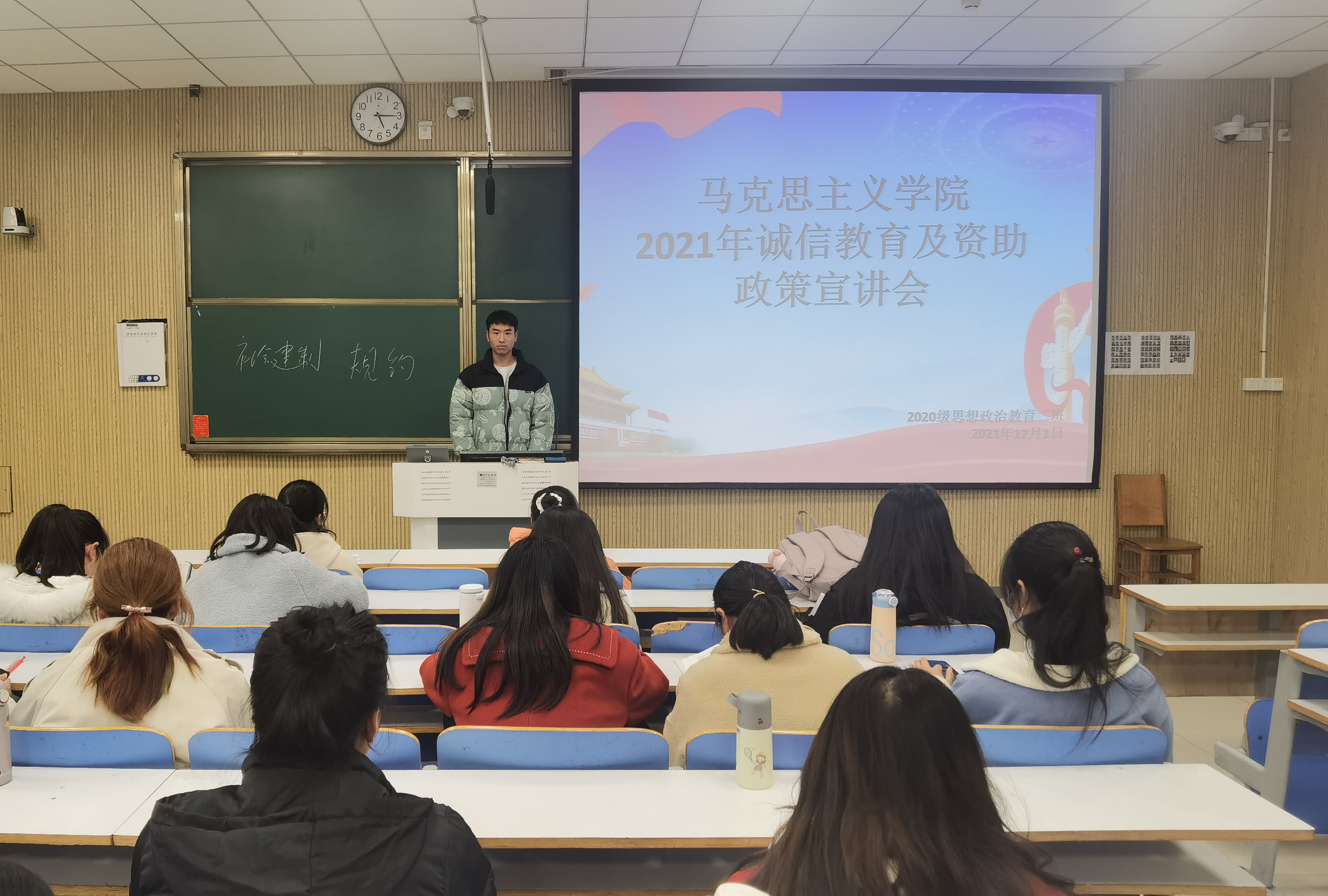为进一步推进beat365资助政策和资助育人宣传工作,切实增强资助工作实效。12月1日下午,beat365在线唯一官网2020级思想政治教育二班、定向二班在社科楼515教室召开诚信教育及资助政策宣传主题班会。2020级思想政治教育二班、定向二班全体同学共同参与本次班会。班会由副班长高红凯主持。