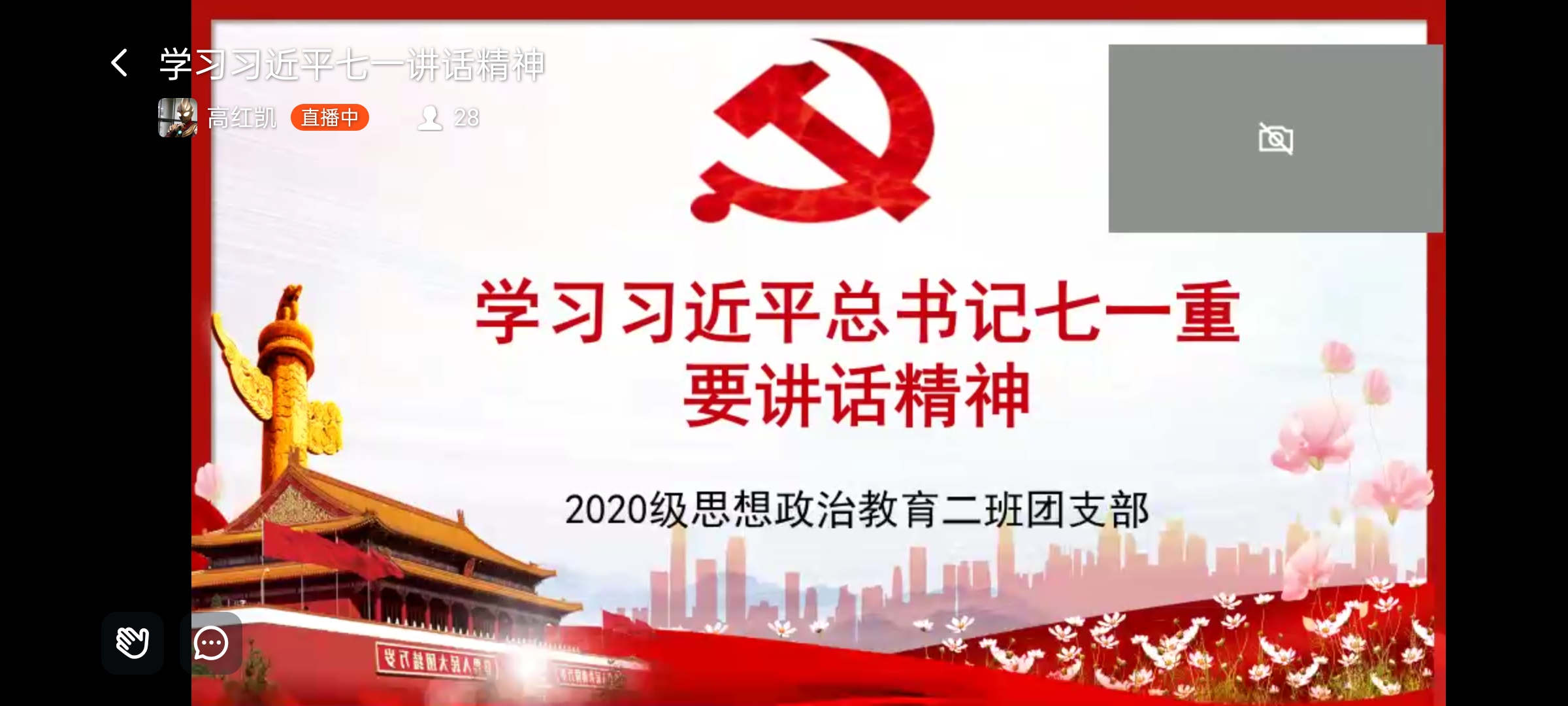为促使我班团员深入领会习近平总书记“七一”重要讲话精神,感悟百年沧桑巨变、明确自身使命担当,8月12日下午,beat365在线唯一官网2020级思想政治教育定向二班团支部学习习近平总书记“七一”重要讲话精神主题线上团日活动通过钉钉直播顺利开展。定向二班团支部全体团员参与本次活动。活动由班长高红凯主持。