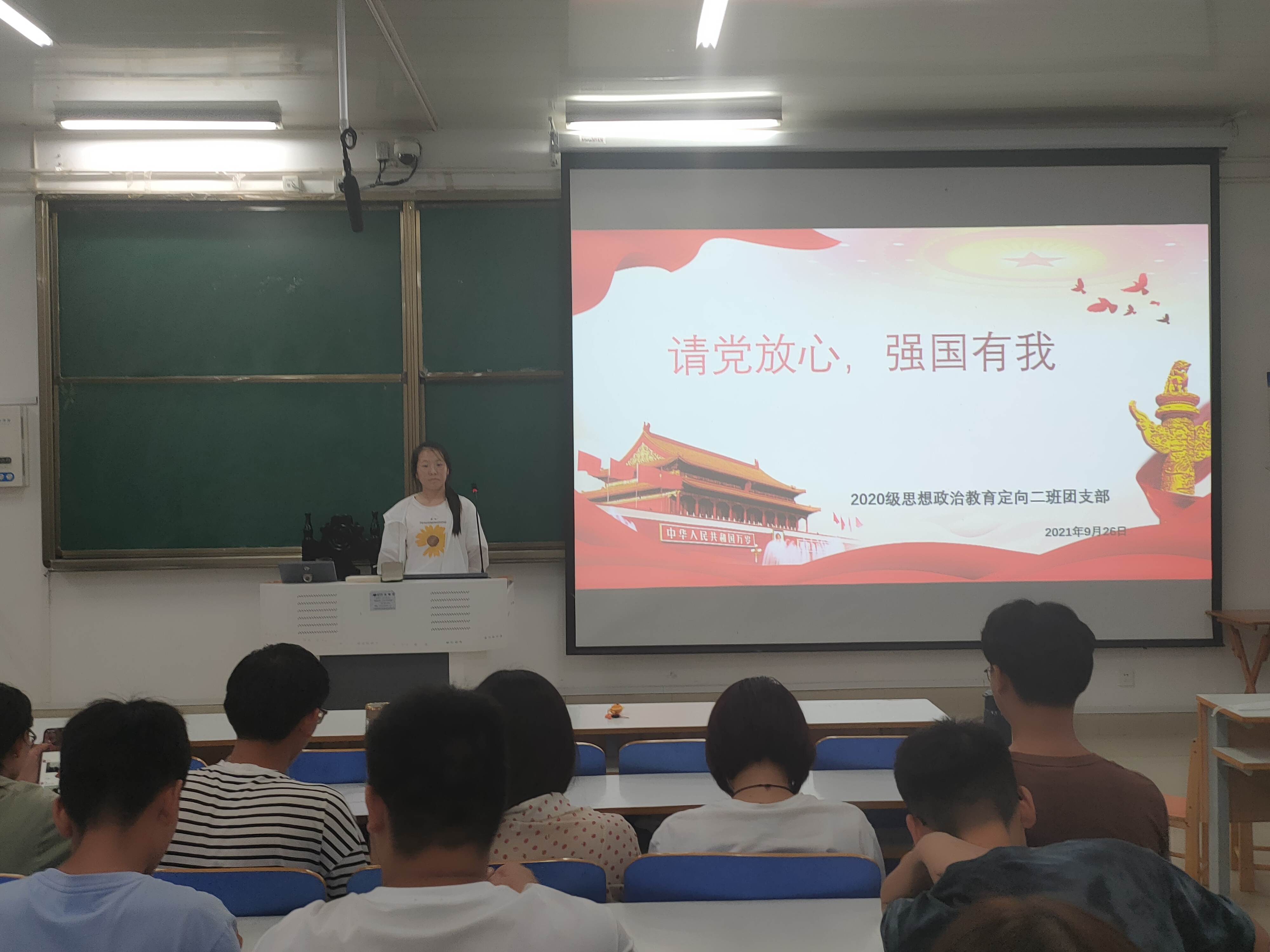 9月26日晚上,beat365在线唯一官网2020级思想政治教育二班、定向二班在社科楼514教室顺利开展“请党放心,强国有我”主题团课。二班、定向二班全体团员共同参加本次团课,团课由孙晶晶、黄敏主持。