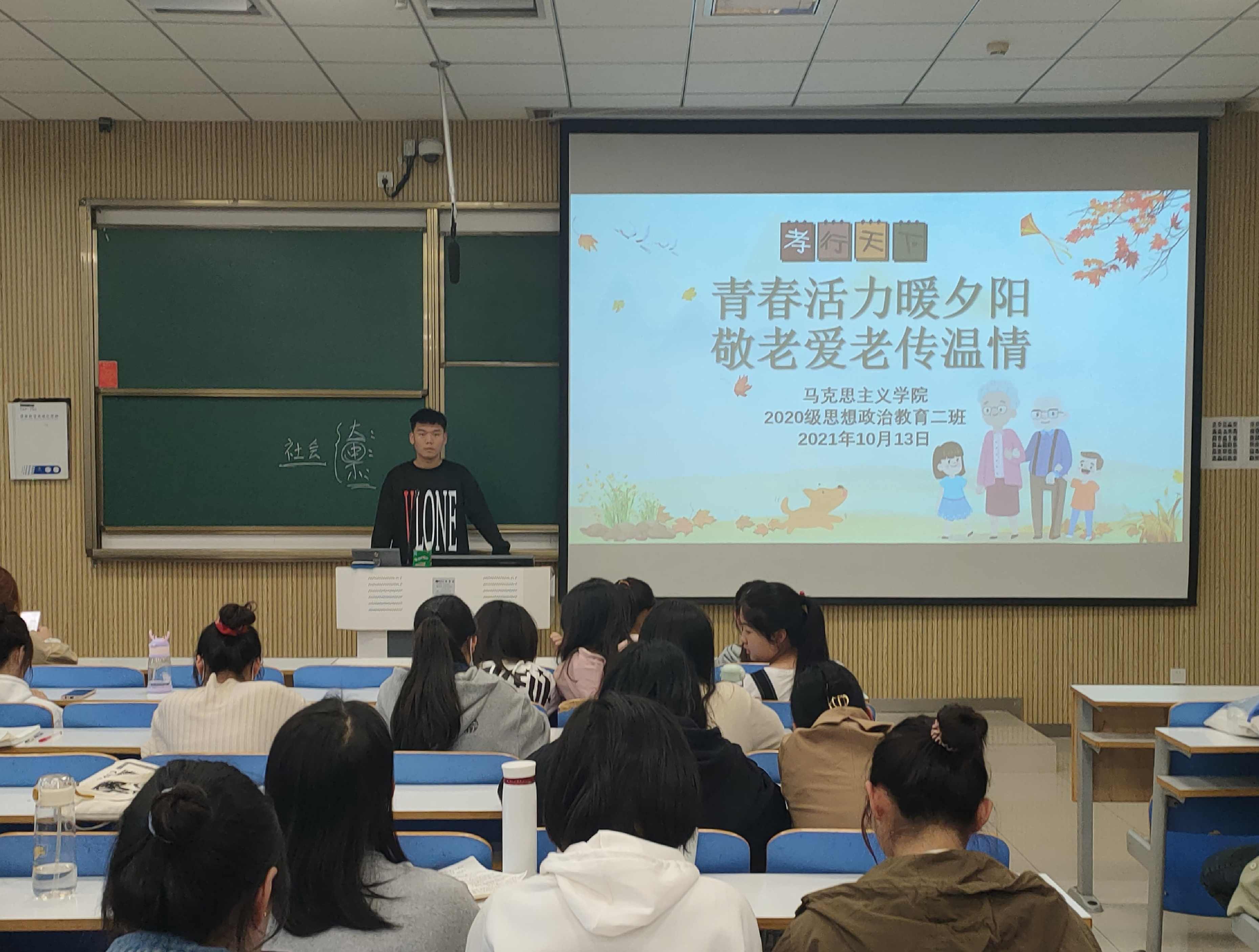 为弘扬孝老敬老的中华传统美德,10月13日下午,beat365在线唯一官网2020级思想政治教育二班、定向二班“青春活力暖夕阳,敬老爱老传温情”主题团课在社科楼515教室顺利开展。二班、定向二班全体团员共同参与本次团课。团课由程歌讲授。