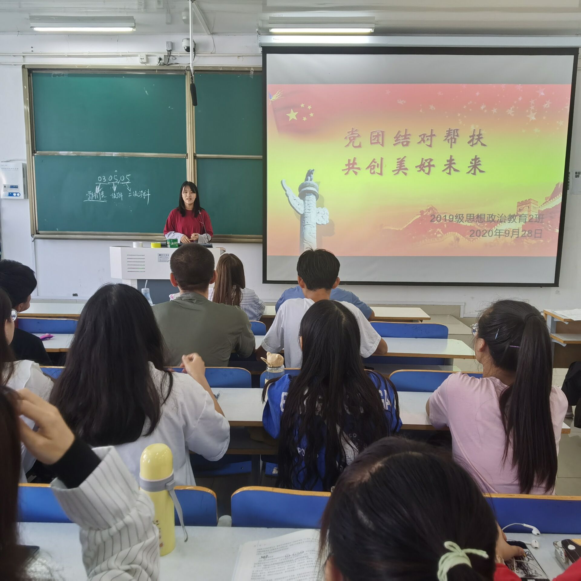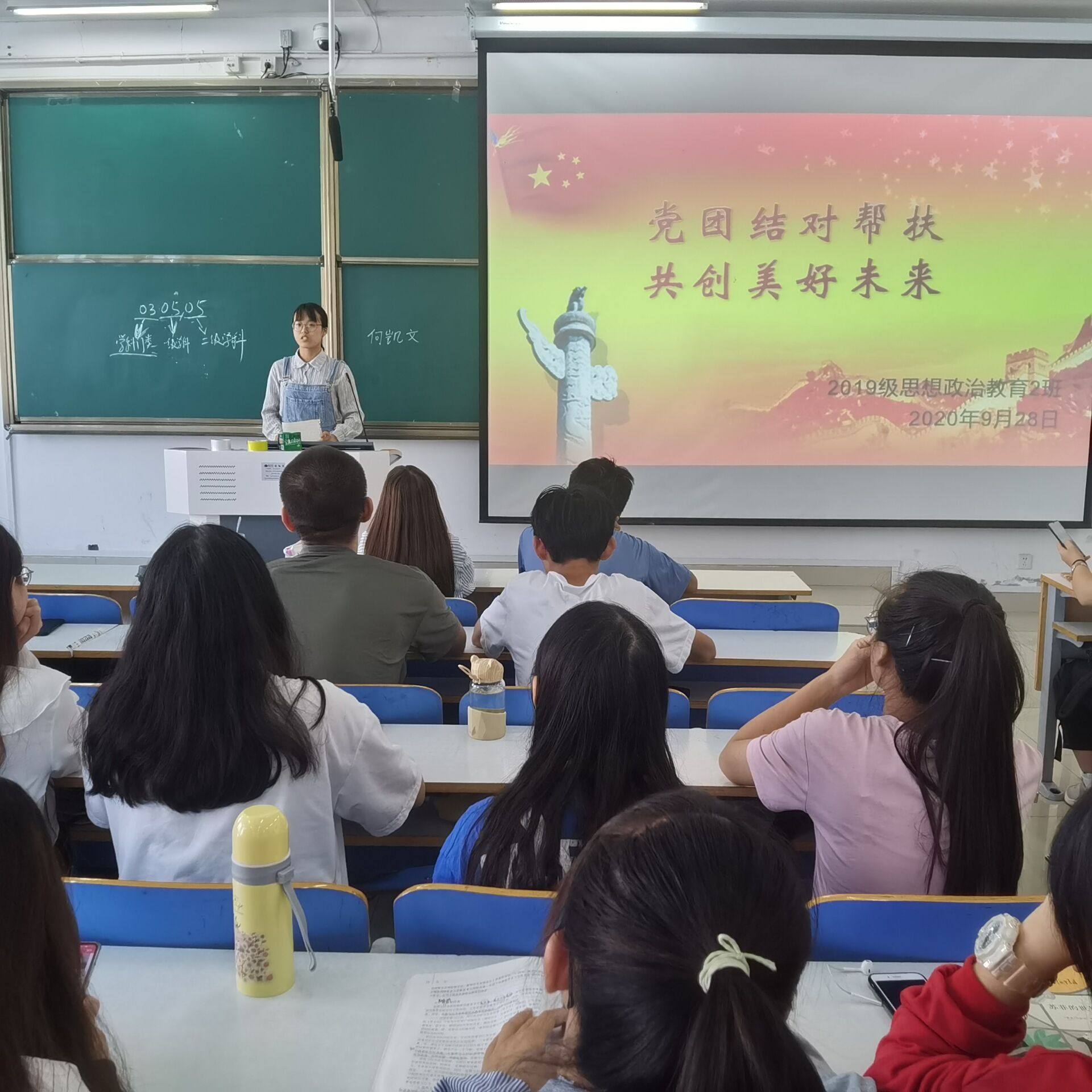 9月28日上午,beat365在线唯一官网2019级思想政治教育二班在社科楼516教室召开了“党团结对帮扶,共创美好未来”主题会议。beat365预备党员张晓艳、王文芳及2019级思想政治教育二班全体成员共同参会。会议由团支书孙雅娴主持。