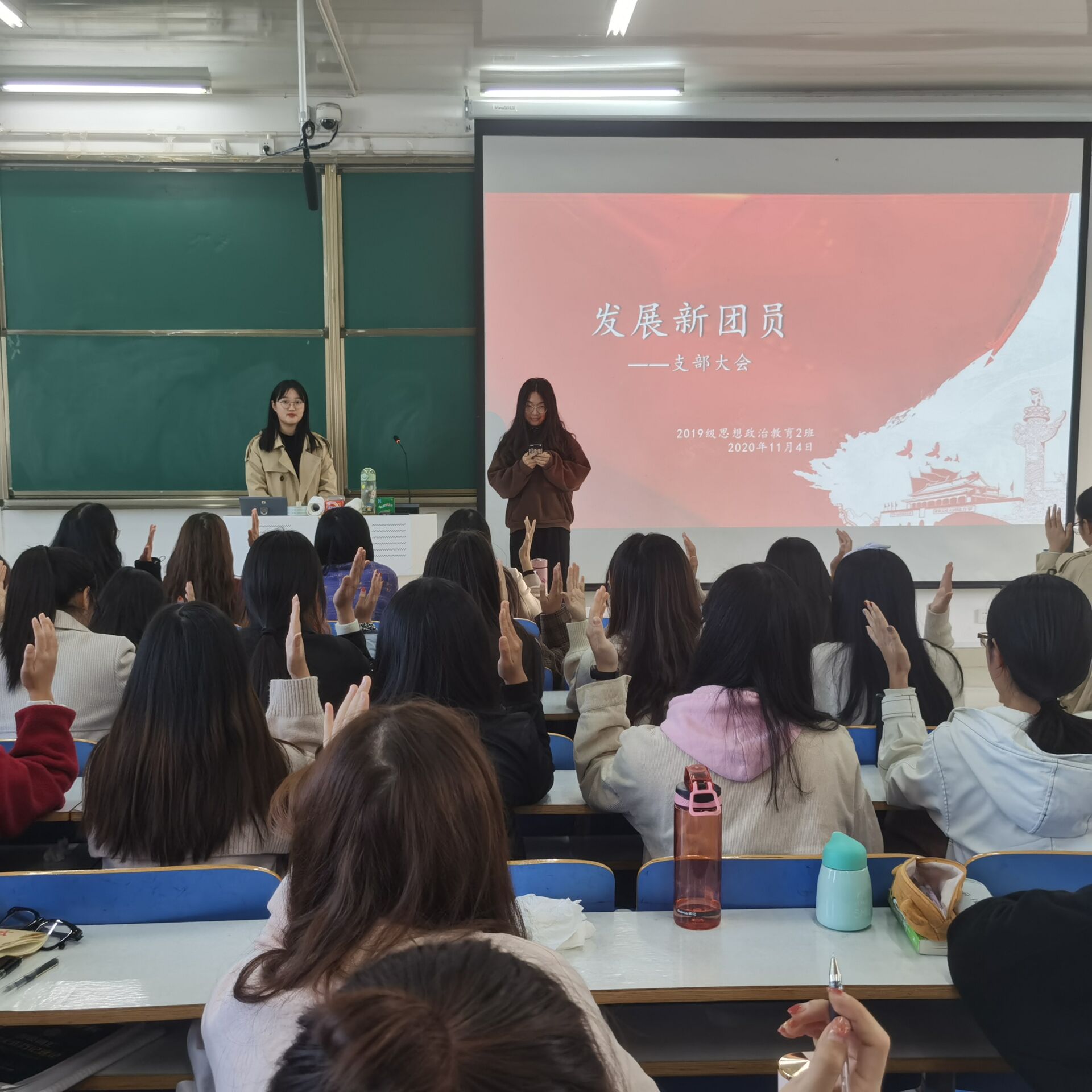 11月4日下午,beat365在线唯一官网2019级思想政治教育二班在社科楼514教室召开“发展新团员”主题会议。2019级思想政治教育二班全体成员共同参会。会议由团支书孙雅娴主持。