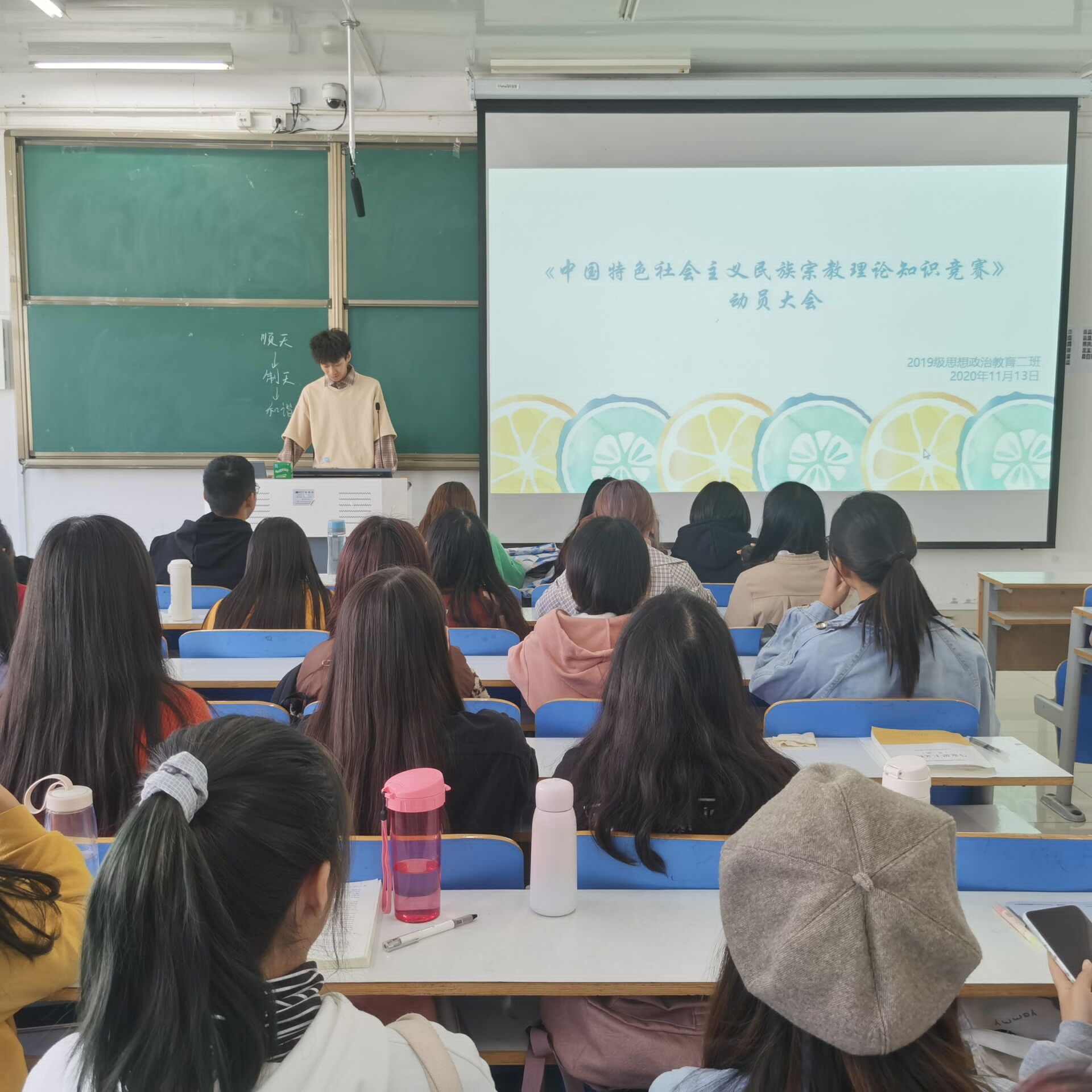 为引导学生们树立正确的民族宗教观,自觉抵制宗教渗透。11月13日上午,beat365在线唯一官网2019级思想政治教育二班在社科楼516教室召开以中国特色社会主义民族宗教理论知识竞赛为主题的动员大会。beat365在线唯一官网2019级思想政治教育二班全体学生共同参会。本次会议由班长吕昂主持。