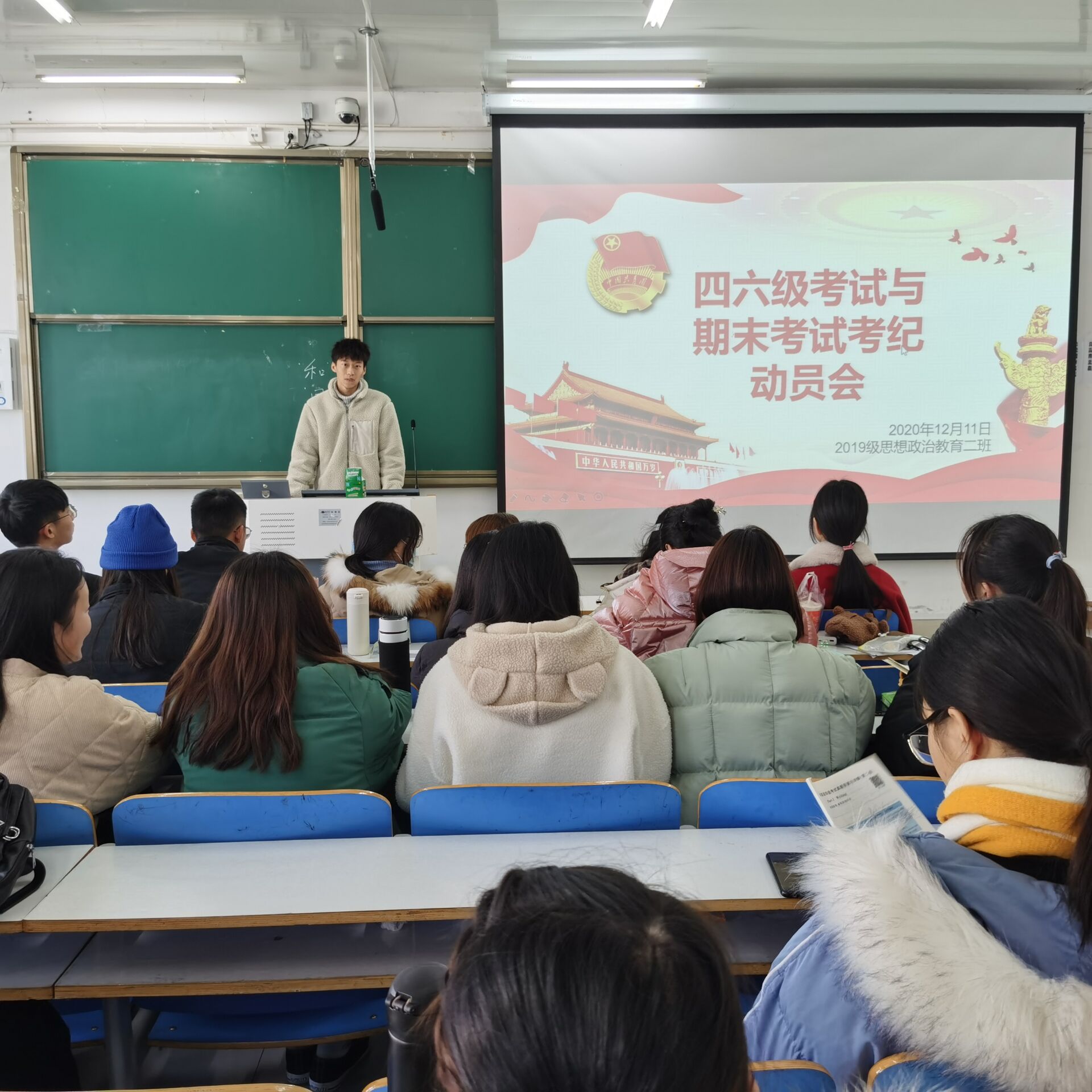 为帮助同学们更好地应对英语四级考试与期末考试,严肃考场纪律。12月11日下午,beat365在线唯一官网2019级思想政治教育二班在社科楼514教室召开了大学生英语四级考试与期末考试动员大会。辅导员陶青青和beat365在线唯一官网2019级思想政治教育二班全体成员共同参会。本次会议由副班长吕昂主持。