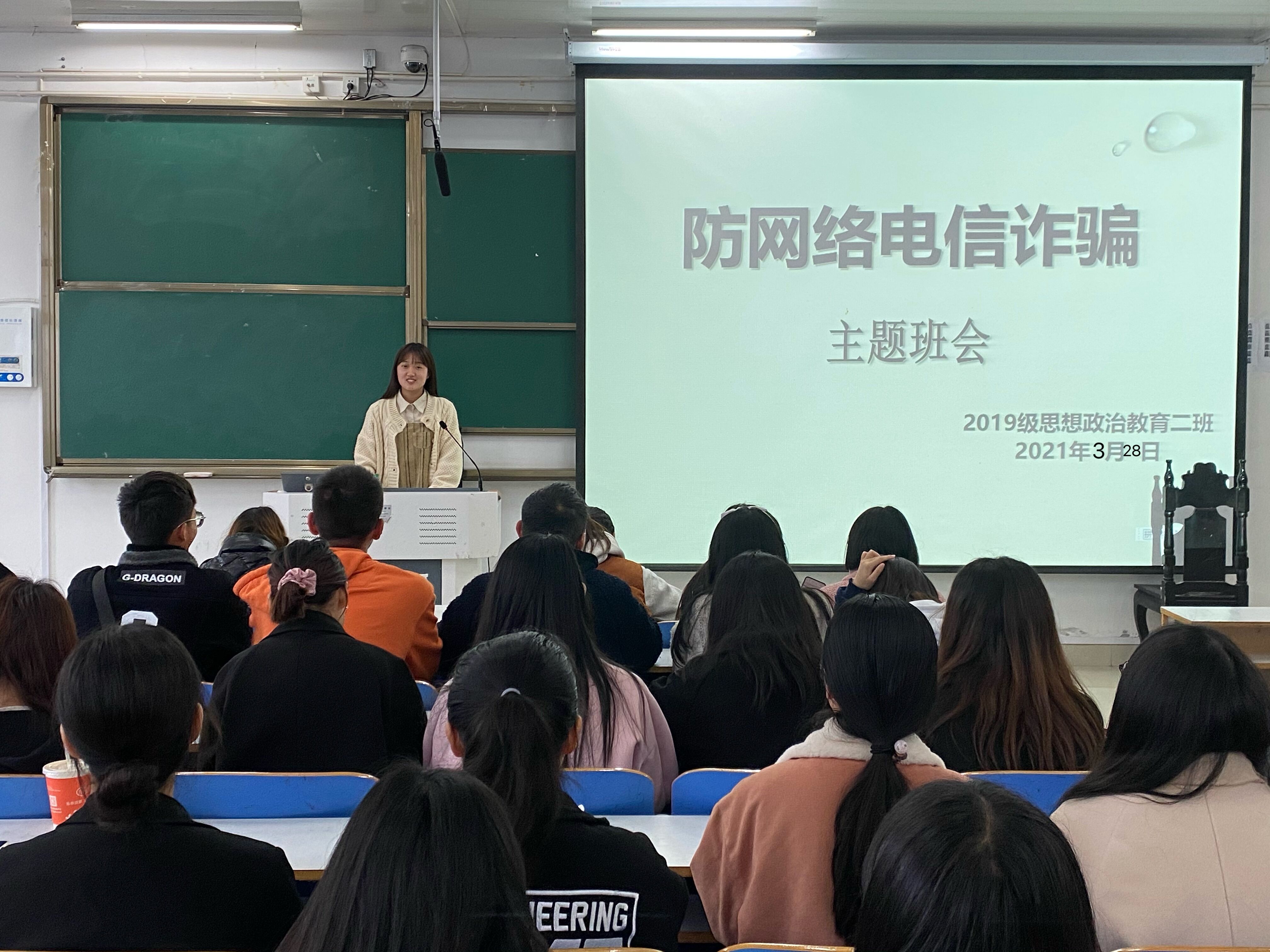 为进一步提升我校大学生网络防诈骗意识,增强防范网络诈骗能力,3月28日上午,beat3652019级思想政治教育二班在社科楼516教室召开“防网络电信诈骗”主题会议。2019级思想政治教育二班全体成员共同参会。会议由团支书孙雅娴主持。