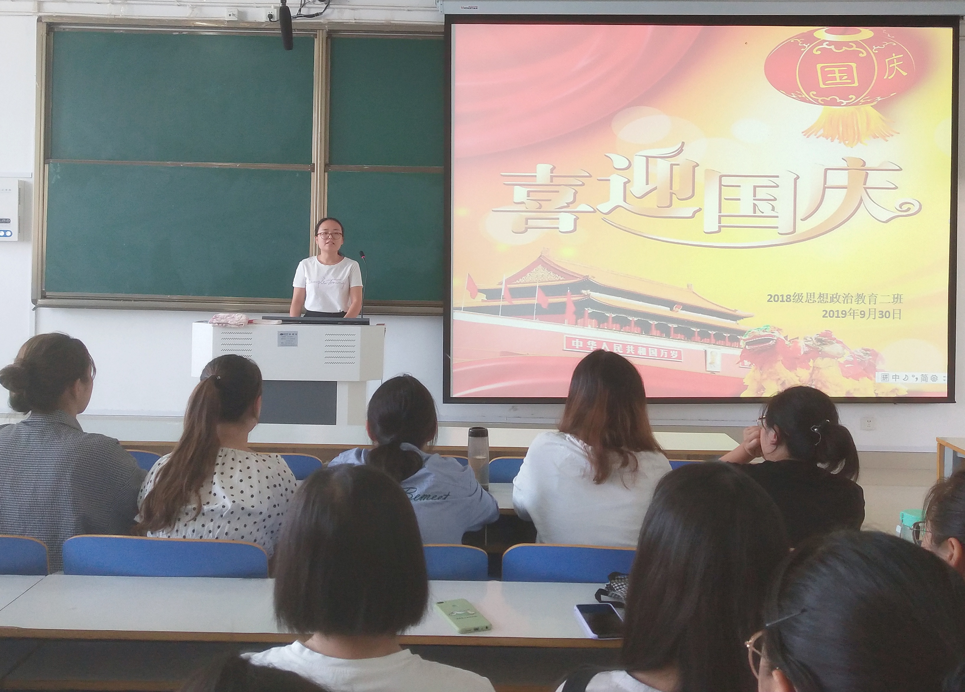 9月30日上午,beat3652018级思想政治教育二班在社科楼514教室开展了“喜迎祖国七十华诞”主题班会。辅导员曹菁菁、2018级思想政治教育二班全体成员共同参加了本次班会。班会由班长杨康主持。