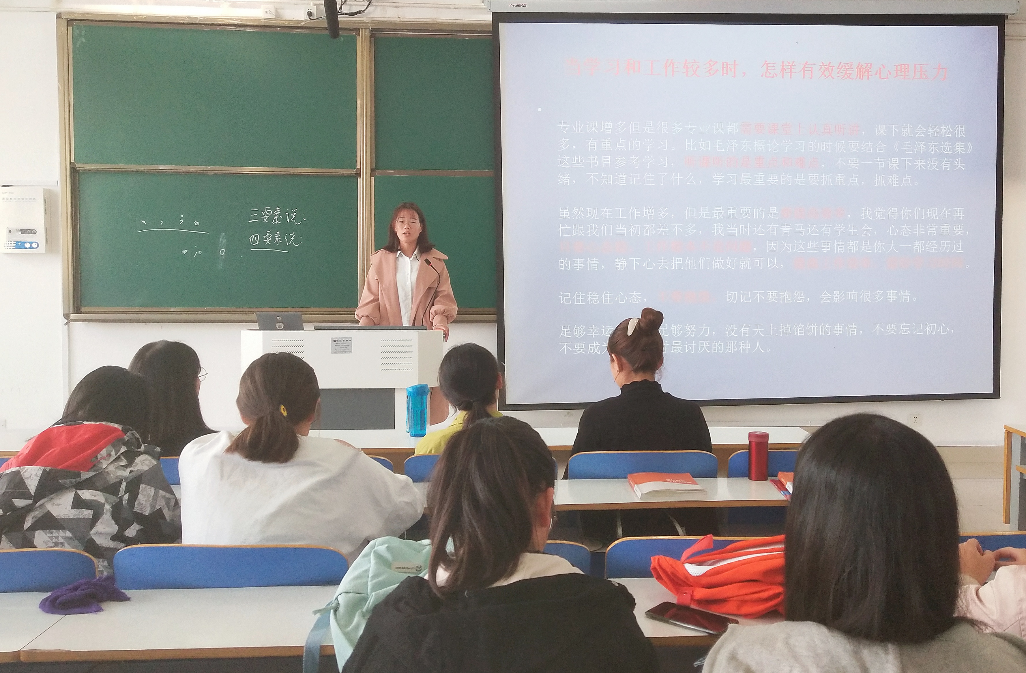 首先,席妞强调了心理健康的重要性。她讲到,健康的心理品质是促进大学生全面发展,保证身心健康成长的重要条件。接着,席妞通过PPT讲解、播放视频的形式,解答同学们的心理健康问题。她建议,在学习上,要将课上认真听讲和课下抓住重难点复习相结合,提高学习效率,保持持久的学习动力;在工作生活中,劳逸结合,保持良好的心态,与老师同学加强沟通交流。最后,曹菁菁老师做出总结。她指出,要学会平衡学习和活动的关系,合理分配时间,调适自我状态;掌握有效的学习方式,以团小组的形式开展学习帮扶,保持积极上进的学习状态;重视科学锻炼,保证健康的身心状态。