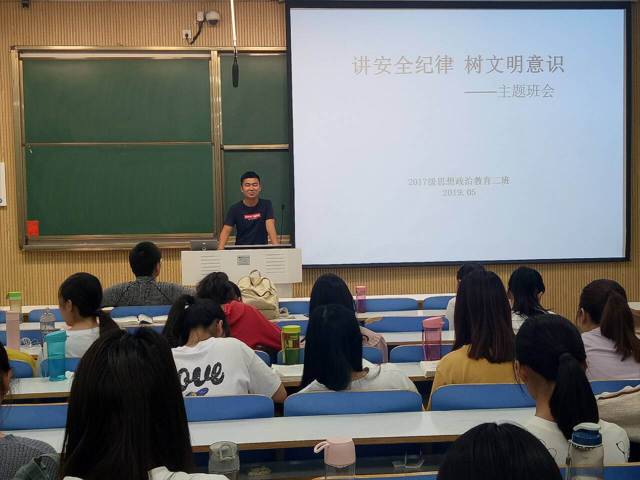 5月21日上午,2017级思想政治教育第二团支部全体团员在社科楼515教室开展安全教育与文明礼仪主题班会,班会由班长艾子元主持。
