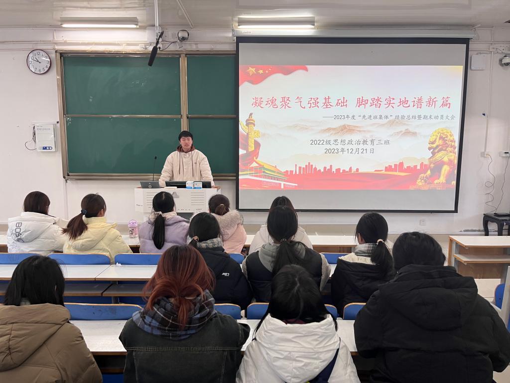 12月21日上午,beat365在线唯一官网2022级思想政治教育三班在社科楼514教室召开“凝魂聚气强基础,脚踏实地谱新篇”主题班会。beat3652022级思想政治教育三班全体成员共同参与此次班会,班会由班长余浩洋主持。