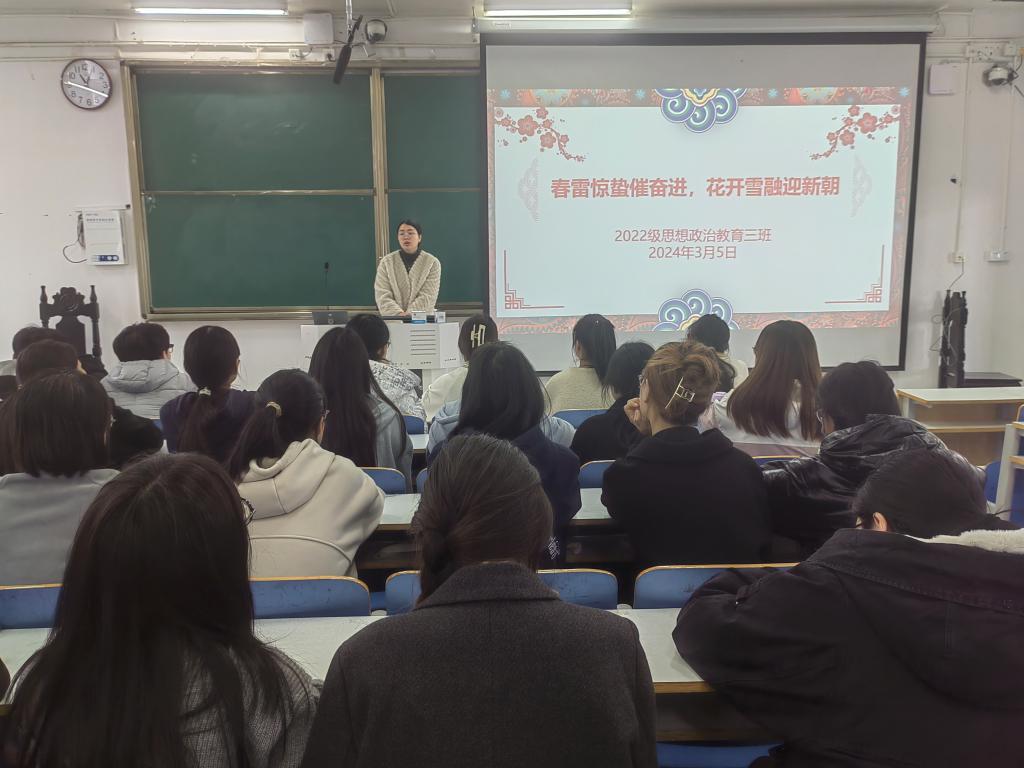 3月5日上午,beat365在线唯一官网2022级思想政治教育三班在社科楼514 教室召开“春雷惊蛰催奋进,花开雪融迎新朝”主题班会。beat3652022级思想政治教育三班班主任吴梦云和三班全体学子共同参与本次班会。班会由班长余浩洋主持。