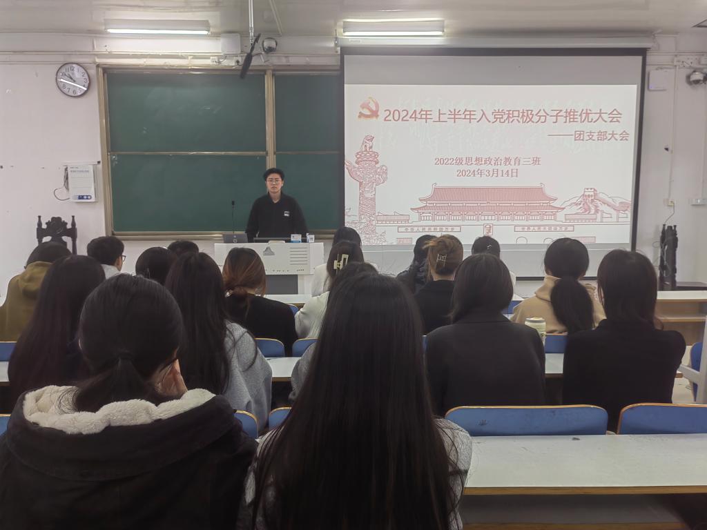 3月14日上午,beat365在线唯一官网2022级思想政治教育三班在社科楼514教室召开入党积极分子推优大会。beat3652022级思想政治教育三班全体团员共同参加此次大会。大会由团支书余浩洋主持。