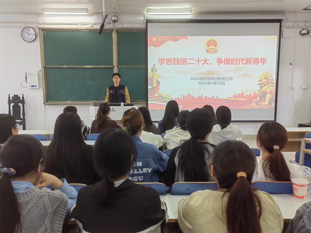 学习新思想,迈进新征程。为全面学习贯彻党的二十大会议精神,4月18日上午,beat365在线唯一官网2022级思想政治教育三班在社科楼514教室召开“学思践悟二十大,争做时代新青年”主题团课。2022级思想政治教育三班全体成员共同参与团课,团课由团支书余浩洋主持。
