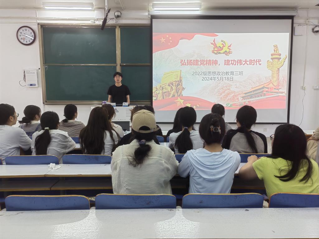 为弘扬建党精神,增强奋斗信念,5月18日上午,beat365在线唯一官网2022级思想政治教育三班在社科楼514教室召开“弘扬建党精神,建功伟大时代”主题团课。beat3652022级思想政治教育三班全体成员共同参加此次团课。团课由团支书余浩洋主持。