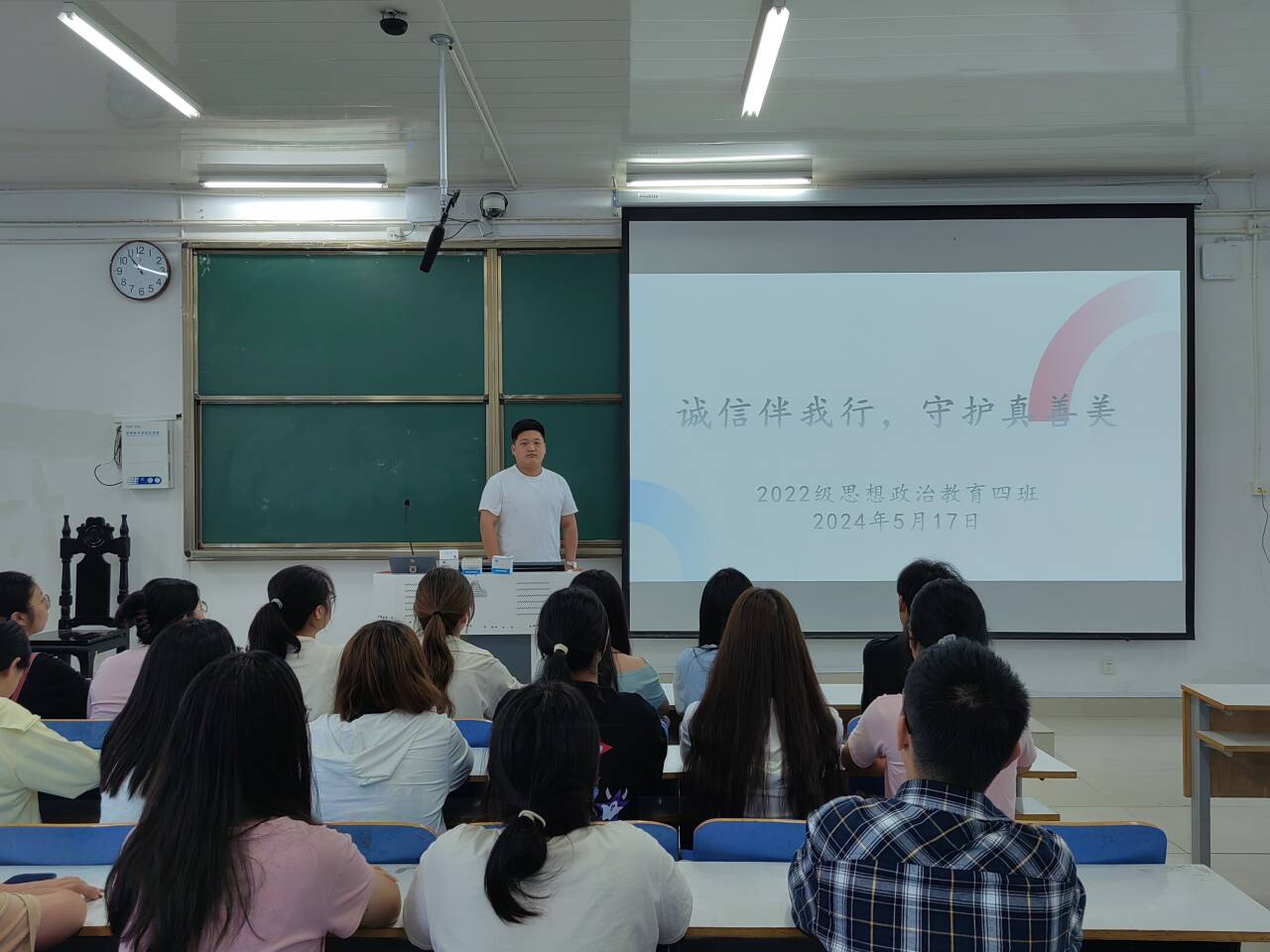 为进一步加强学生道德修养,增强学生诚信意识,在校园形成讲诚信、树诚信、践诚信的良好风气,5月17日上午,beat365在线唯一官网2022级思想政治教育四班在社科楼514教室组织召开“诚信伴我行,守护真善美”主题班会。beat3652022级思想政治教育四班全体成员参与本次班会。本次团课由副班长宋奕铭主持。