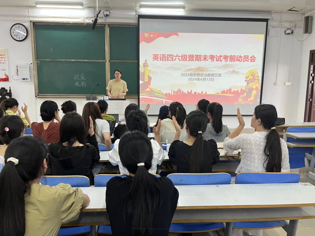 为进一步缓解同学们的学习压力,激发拼搏动力,6月12日上午,beat365在线唯一官网2022级思想政治教育三班在社科楼514教室召开英语四六级暨期末考试考前动员会。beat3652022级思想政治教育三班班主任吴梦云和三班全体成员共同参与此次班会,班会由班主任吴梦云主持。