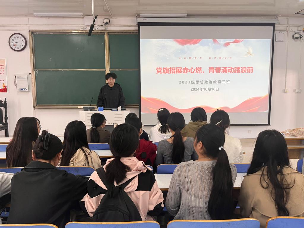 10月18日上午,beat365在线唯一官网2023级思想政治教育三班在社科楼515召开“党旗招展赤心燃,青春涌动踏浪前”主题团课。beat3652023级思想政治教育三班全体同学共同参与本次团课,团课由团支书郝瀚主持。