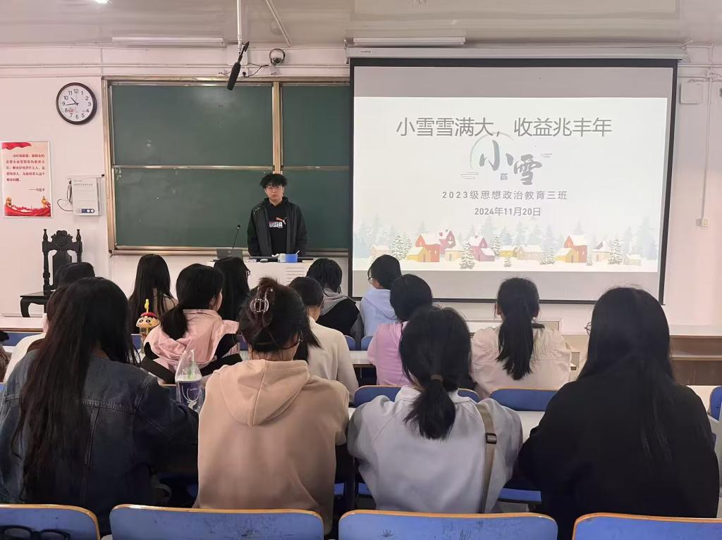 班会伊始,郝瀚指出,小雪,是二十四节气中的第20个节气、冬季的第2个节气,时间在每年公历11月22日或23日。小雪是反映降水与气温的节气,它的到来意味着天气会越来越冷、降水量渐增。接着,郝瀚通过PPT为同学们介绍小雪节气的由来、关于小雪的民俗文化和有关小雪的诗歌等,使同学们不仅了解了“小雪”的意义、传统习俗以及有关小雪诗句的赏析,也更加形象地感受了我们中国的传统文化。最后,郝瀚提出建议,同学们要主动了解传统文化习俗,推动传统文化的继承。同时,同学们也要做好保暖,健康地度过每一天。