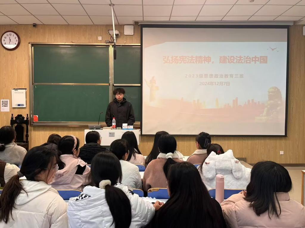 为弘扬宪法精神,推进全面依法治国,12月7日上午,beat365在线唯一官网2023级思想政治教育三班在社科楼515召开“弘扬宪法精神,建设法治中国”主题团课。beat3652023级思想政治教育三班全体同学共同参与本次团课,团课由团支书郝瀚主持。