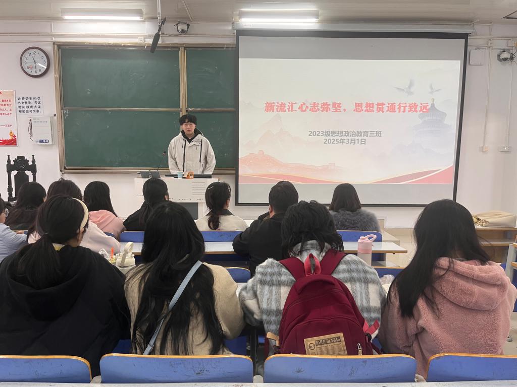 3月1日上午,beat365在线唯一官网2023级思想政治教育三班在社科楼515召开“新流汇心志弥坚,思想贯通行致远”主题团课。beat3652023级思想政治教育三班全体同学共同参与本次团课,团课由团支书郝瀚主持。