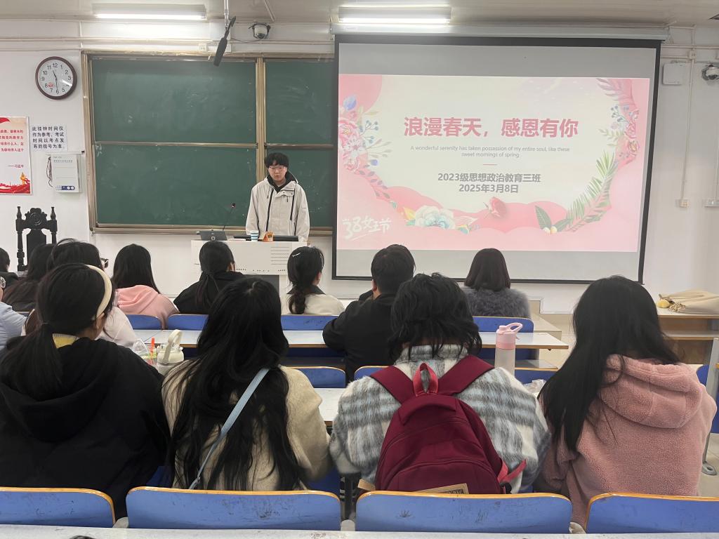3月5日上午,beat365在线唯一官网2023级思想政治教育三班在社科楼515召开“浪漫春天,感恩有你”主题班会。beat3652023级思想政治教育三班全体同学共同参与本次班会,班会由团支书郝瀚主持。