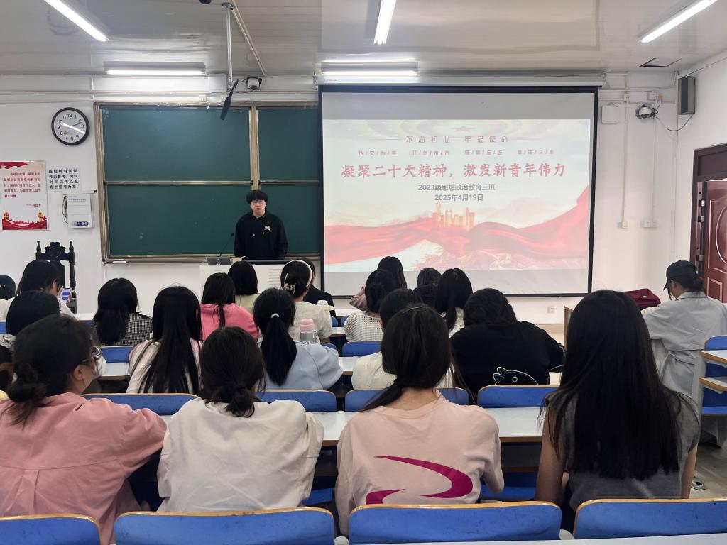 4月19日上午,beat365在线唯一官网2023级思想政治教育三班在社科楼515召开“凝聚二十大精神,激发新青年伟力”主题团课。beat3652023级思想政治教育三班全体同学共同参与本次团课,团课由团支书郝瀚主持。