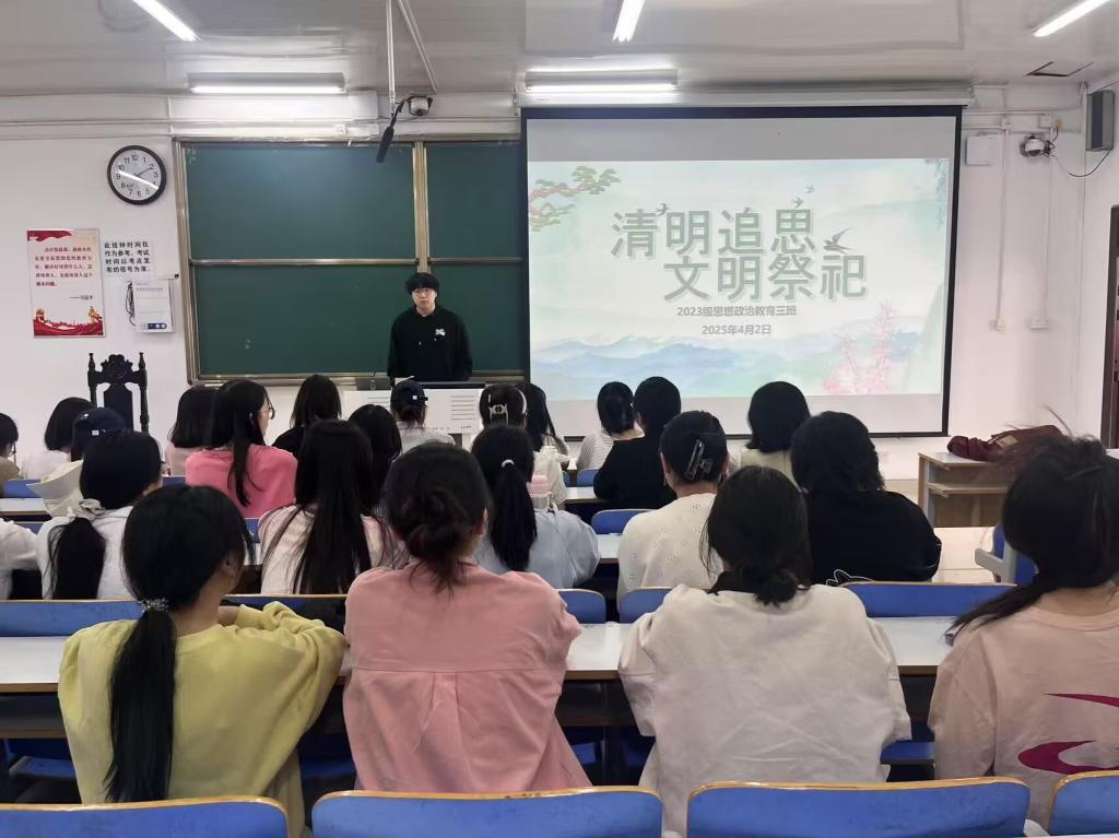 4月2日上午,beat365在线唯一官网2023级思想政治教育三班在社科楼515召开“清明追思,文明祭祀”主题班会。beat3652023级思想政治教育三班全体同学共同参与本次班会,班会由团支书郝瀚主持。
