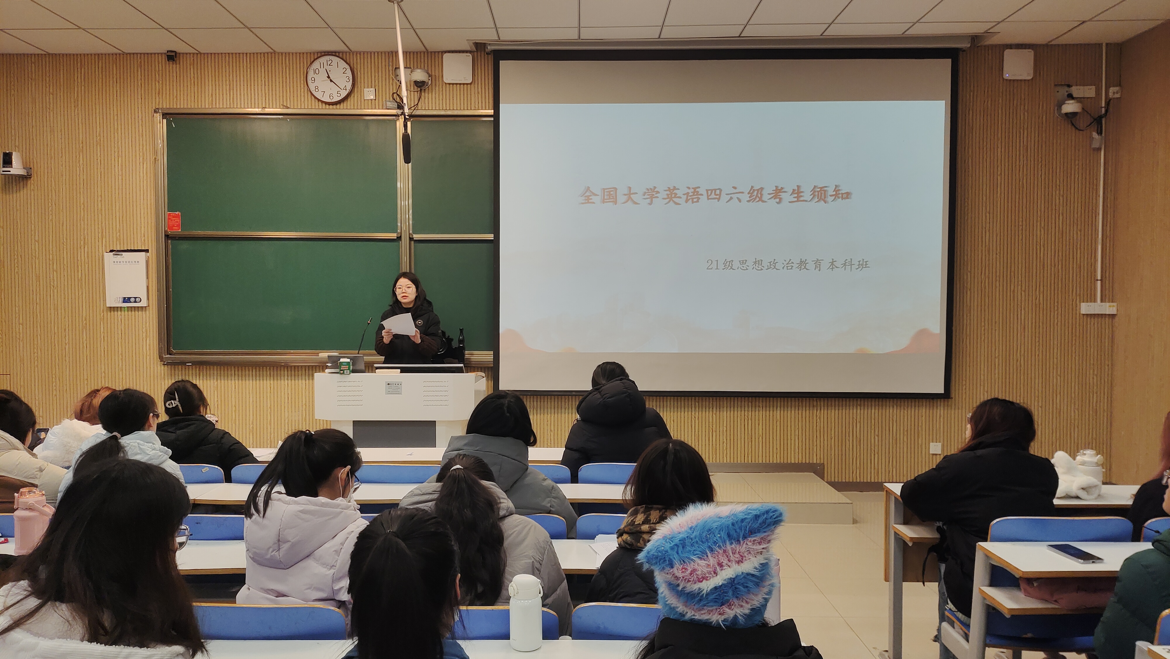 12月14日上午,beat365在线唯一官网2021级思想政治教育全体成员在社科楼514教室召开“全国大学英语四六级考生须知”班会。辅导员高小佳及2021级思想政治教育一班、二班全体成员参加本次班会。班会由辅导员高小佳主持。