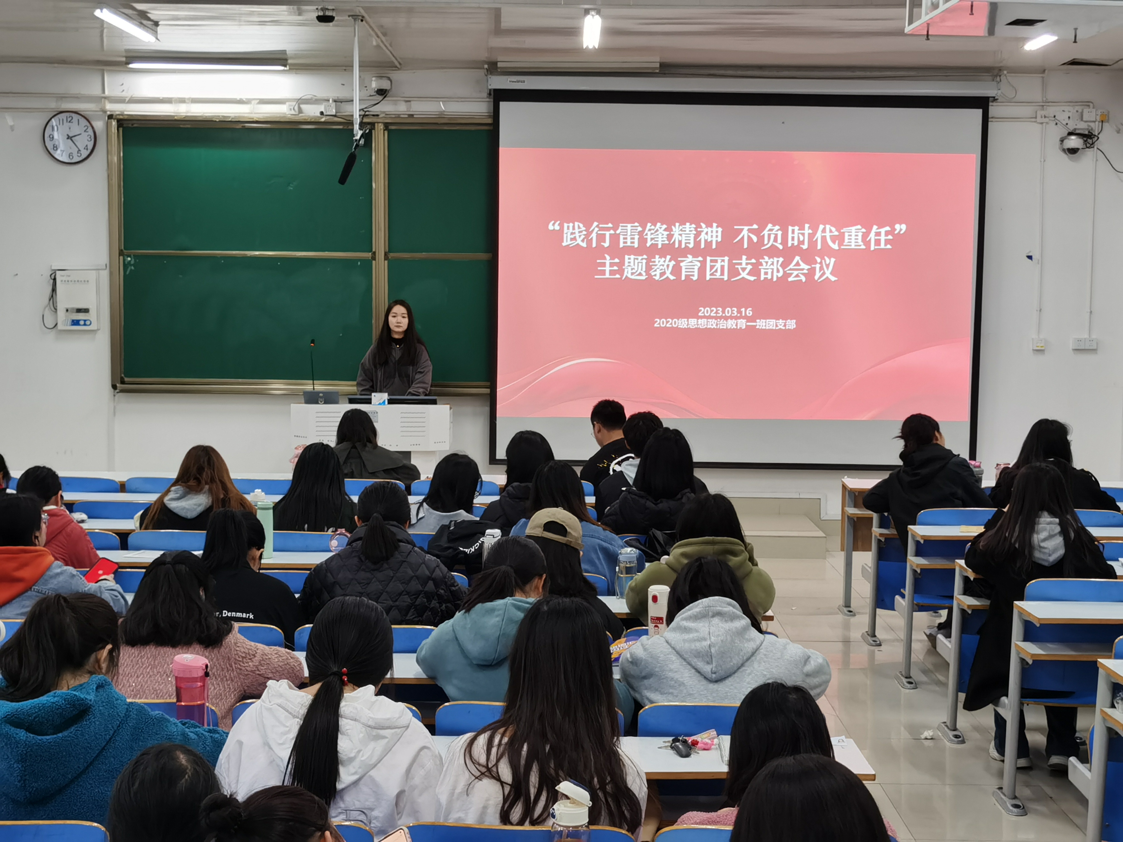 为贯彻落实习近平总书记关于学习雷锋精神和开展志愿服务工作的重要指示精神,加强团支部同学的思想品德教育,3月16日下午,beat365在线唯一官网2020思想政治教育一班在社科楼514教室开展“践行雷锋精神,不负时代重任“主题团课。2020级思想政治教育一班全体团员参加此次团课。团课由团支部书记卢茜雨主持。