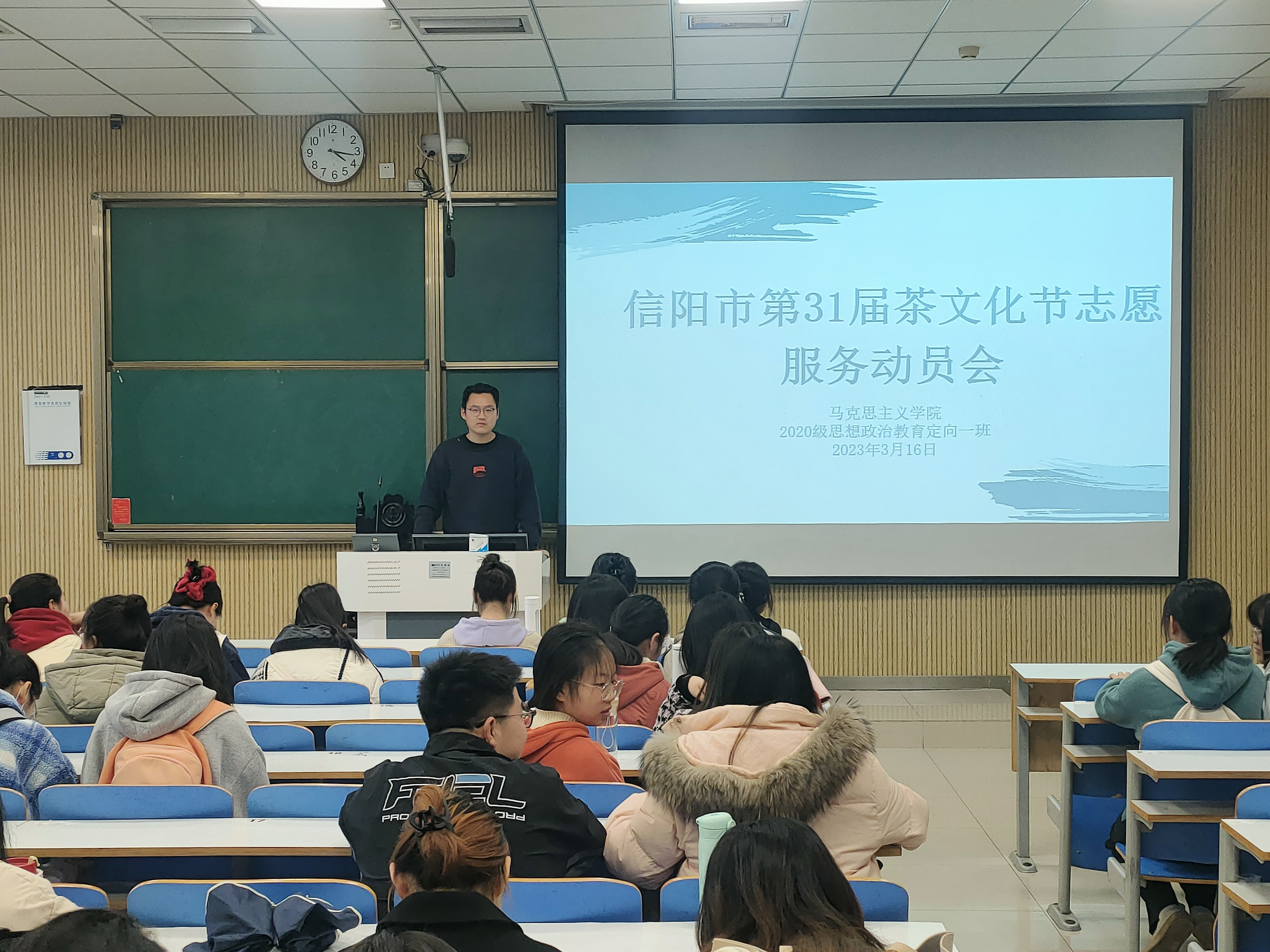 此次动员会贯彻落实了信阳市委常委会会议暨第31届茶文化节筹备会议精神,在2020级思想政治教育定向一班弘扬了奉献、有爱、互助、进步的志愿精神,有利于激励同学们踊跃报名志愿者,做好茶文化节志愿服务保障工作。(beat365在线唯一官网 徐婉姗/供稿 曹栋/审核)