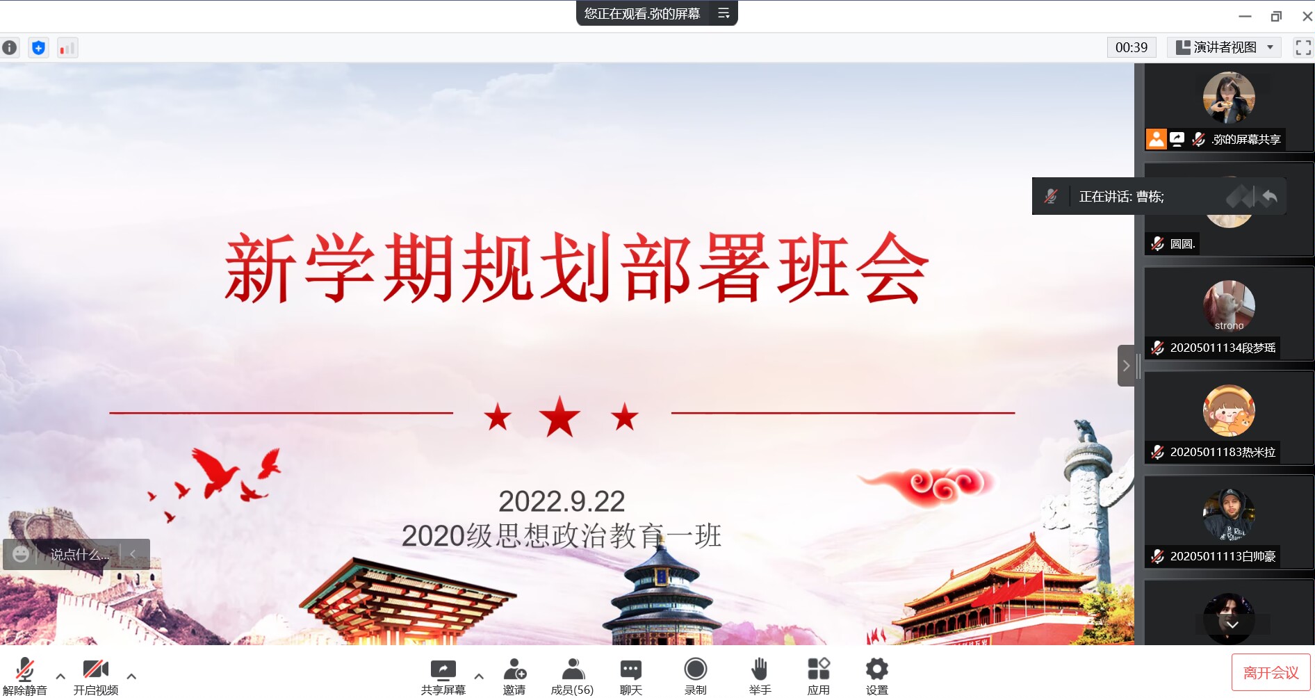 9月22日下午,beat365在线唯一官网2020级思想政治教育一班在腾讯会议上召开新学期规划部署班会。2020级思想政治教育一班全体同学及班主任曹栋共同参加此次班会。班会由曹栋主持。