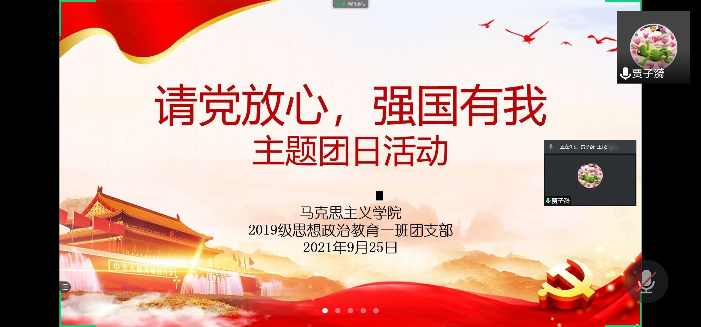9月25日下午,beat365在线唯一官网2019级思想政治教育一班第一团支部在腾讯视频举办“请党放心,强国有我”主题团日活动。beat365在线唯一官网2019级思想政治教育一班全体团员参加本次活动。活动由团支书贾子漪主持。