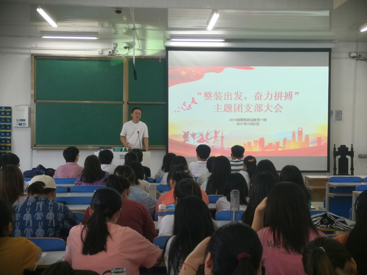 10月2日下午,beat365在线唯一官网2019级思想政治教育一班第一团支部在社科楼515教室召开“整装出发,奋力拼搏”主题团支部大会。beat365在线唯一官网2019级思想政治教育一班辅导员曹栋、全体成员参加本次会议,会议由团支书贾子漪主持。