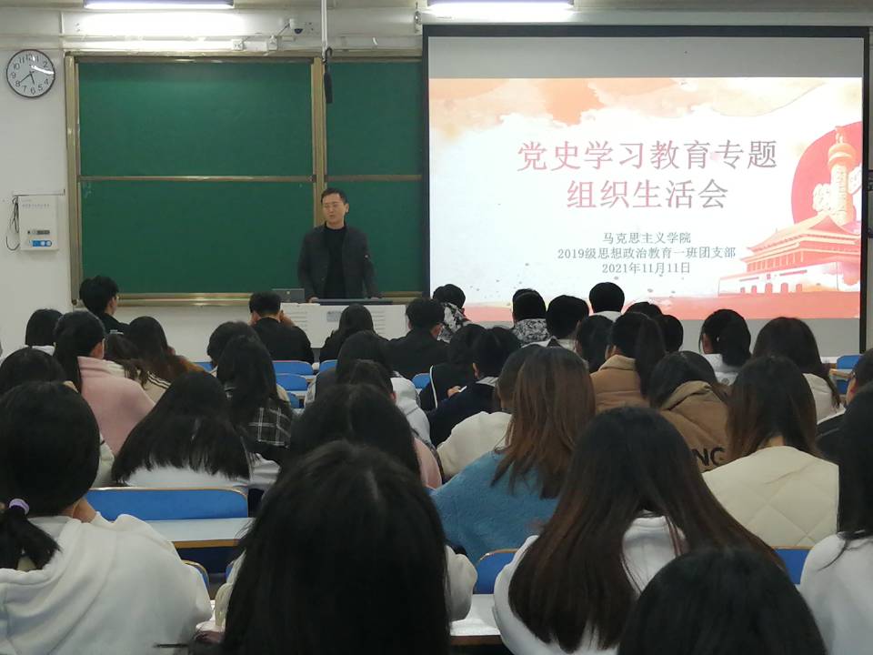 11月11日上午,beat365在线唯一官网2019级思想政治教育一班第一团支部在社科楼516教室召开党史学习教育专题组织生活会。beat365在线唯一官网2019级思想政治教育一班全体成员参加本次会议,会议由班长贾子漪主持。