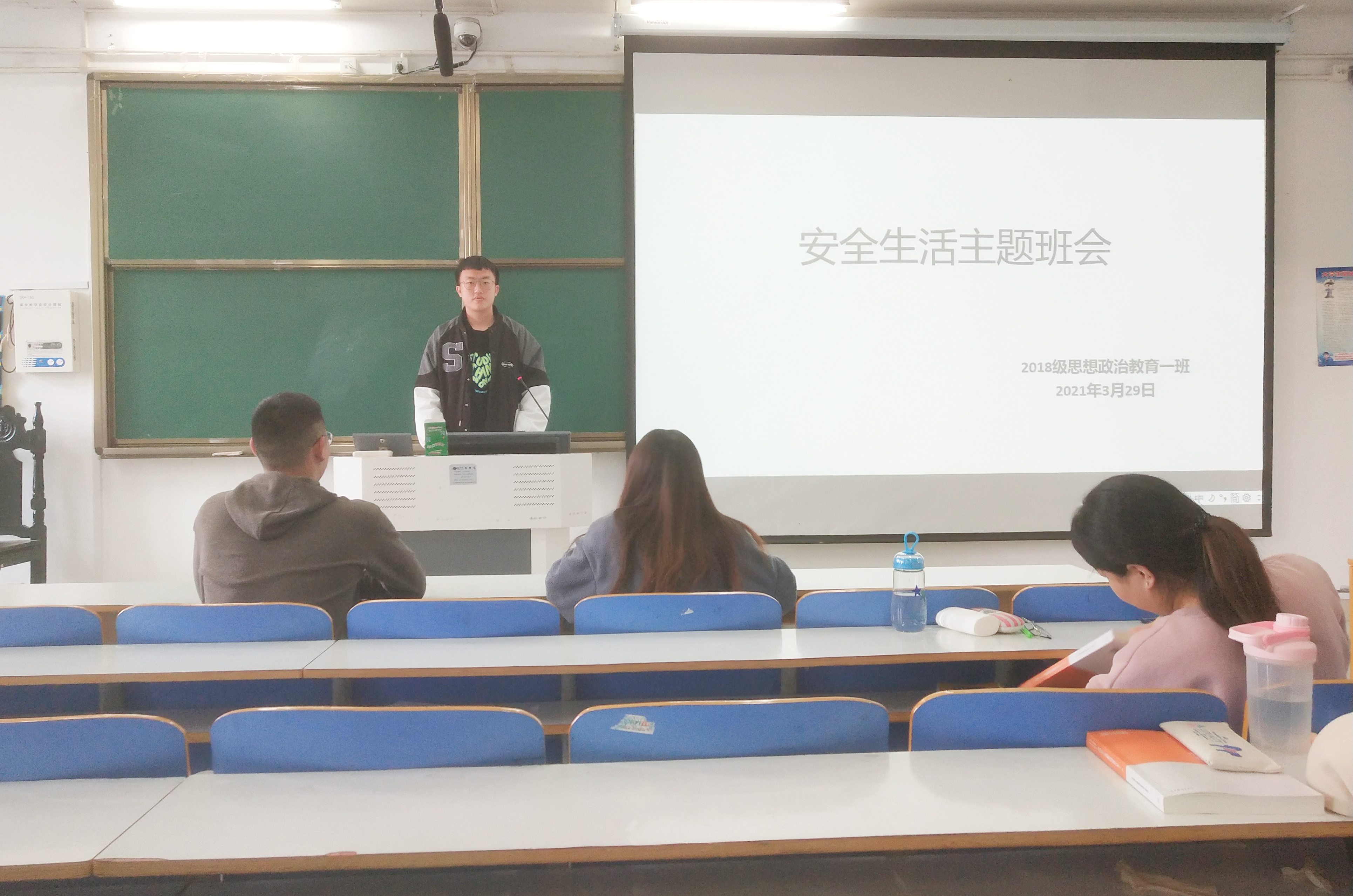 3月29日上午,beat365在线唯一官网2018级思想政治教育一班在社科楼514教室顺利开展安全生活主题班会。2018级思想政治教育一班全体同学参加了本次班会。会议由班长邢子豪主持。