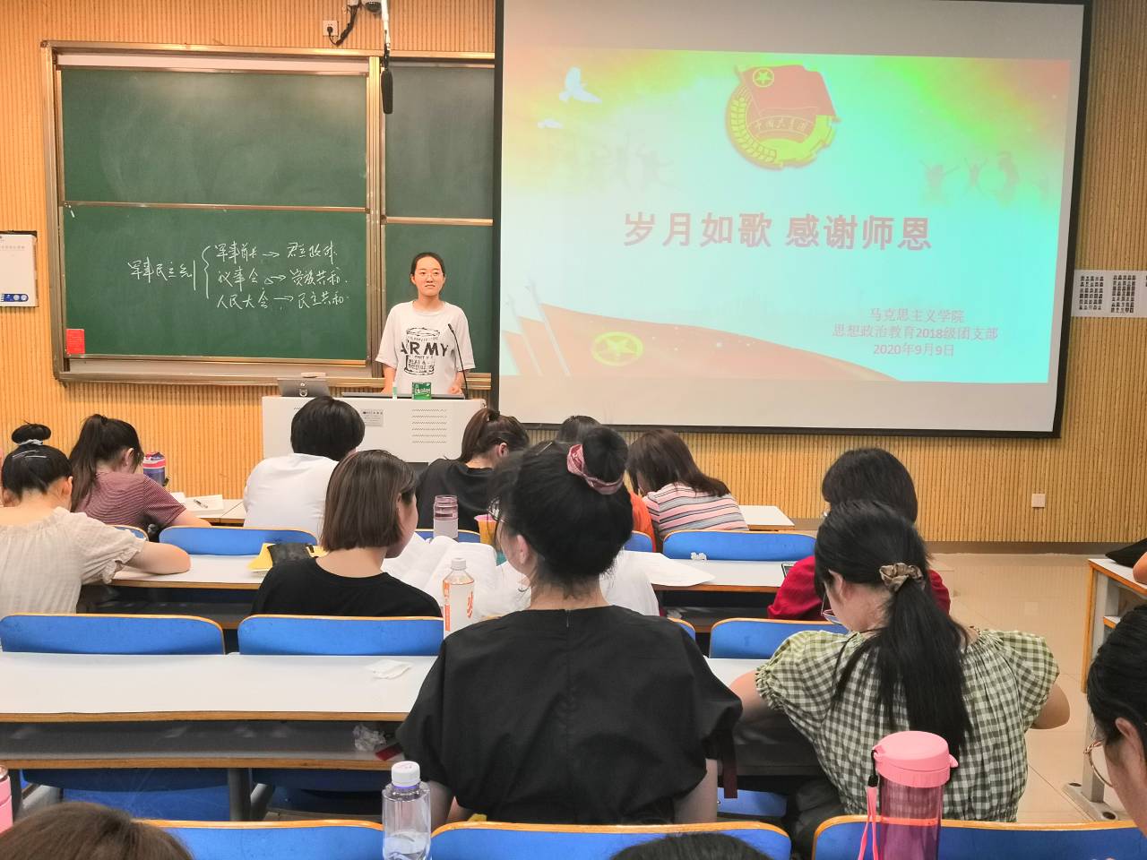9月8日上午,beat365在线唯一官网2018级思想政治教育团支部在社科楼515教室顺利开展“岁月如歌,感谢师恩”主题团会。2018级全体学生共同参加此次会议。会议由第二团支部书记黄子晋主持。