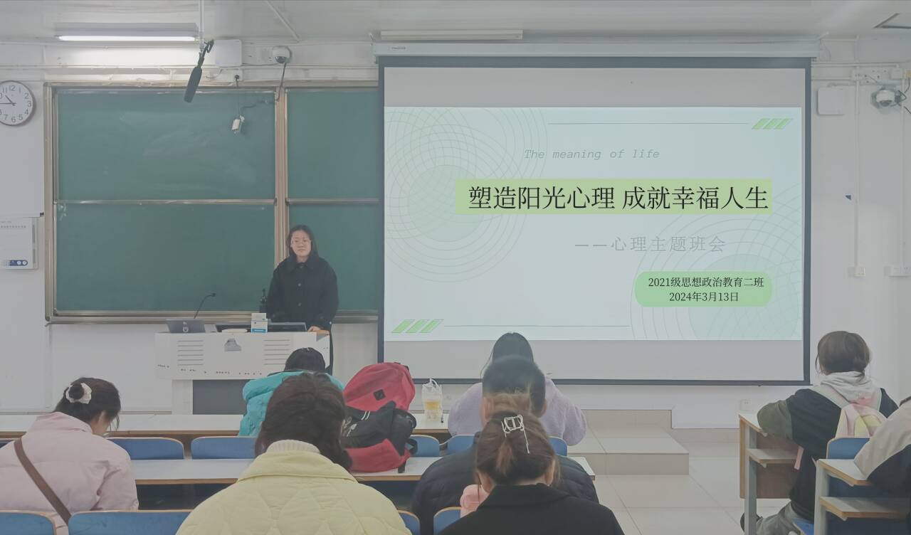 3月13日上午,beat365在线唯一官网2021级思想政治教育二班在社科楼514教室召开“塑造阳光心理,成就幸福人生”心理主题班会。2021级思想政治教育二班全体同学参加此次班会。班会由心理委员李蕾蕾主持。