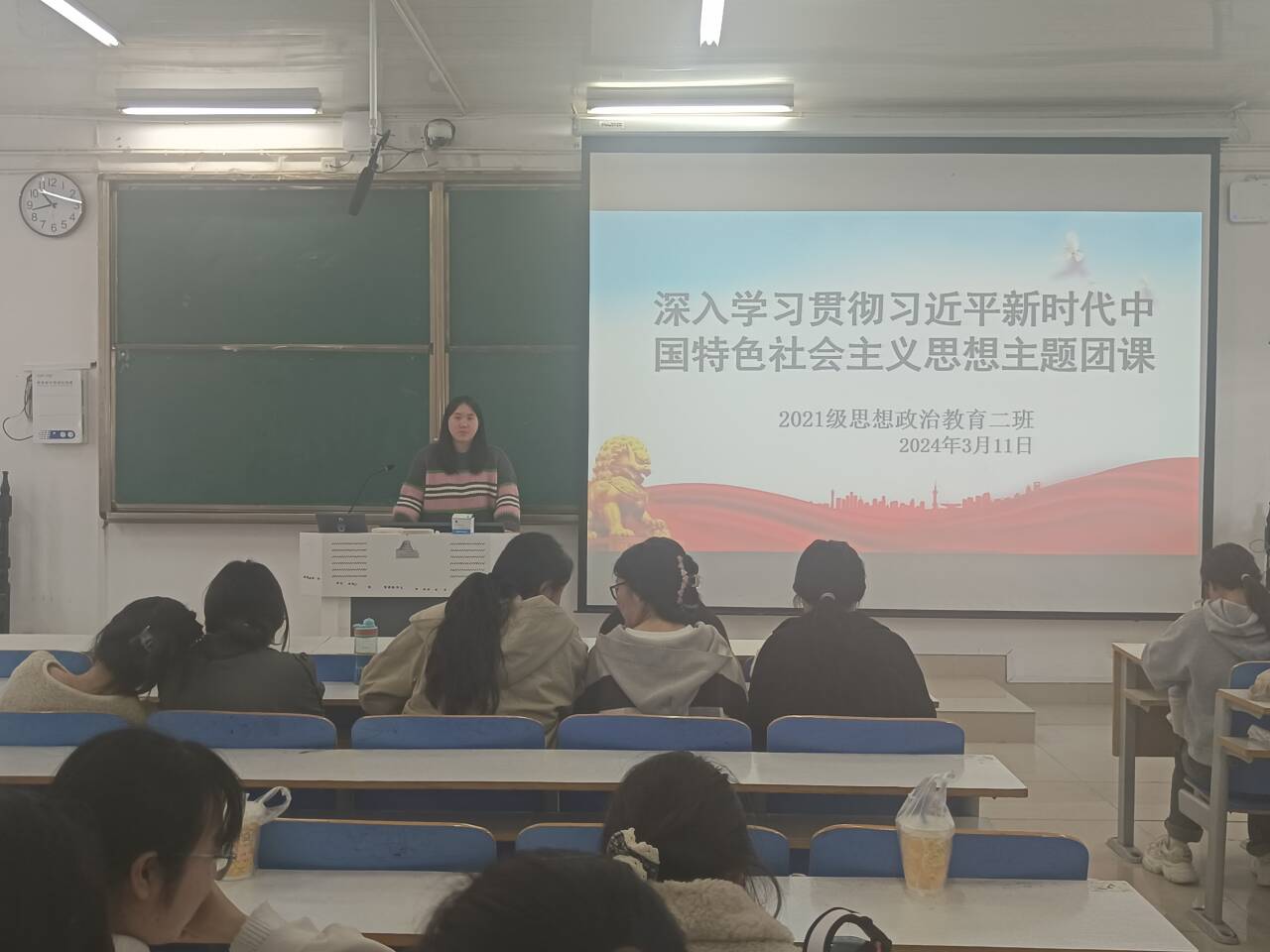 3月11日上午,beat365在线唯一官网2021级思想政治教育二班在社科楼514教室召开“深入学习贯彻习近平新时代中国特色社会主义思想”主题团课。2021级思想政治教育二班全体团员参加此次团课。团课由团支书王婧欣主持。