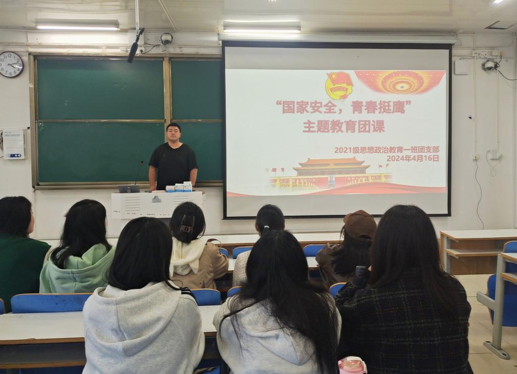 为深入贯彻总体国家安全观,进一步增强学生的国家安全意识,培养学生的爱国情怀,4月16日下午,beat365在线唯一官网2021级思想政治教育一班在社科楼514教室召开“国家安全,青春挺鹰”主题团课。2021级思想政治教育一班全体团员参加了本次团课。团课由团支书戴翰林主持。