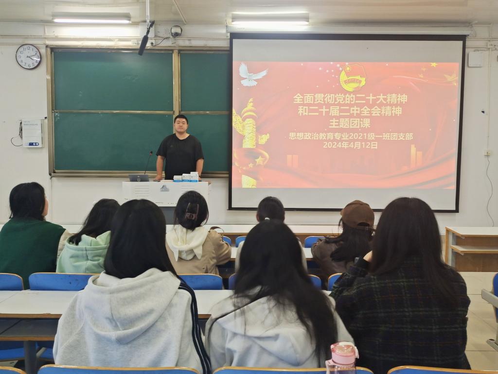 4 月12日下午,beat365在线唯一官网2021级思想政治教育一班在社科楼514教室召开“全面贯彻党的二十大精神和二十届二中全会精神”主题团课。2021级思想政治教育一班全体团员参加了本次团课。团课由团支书戴翰林主持。