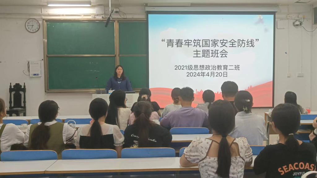 4月20日上午,beat365在线唯一官网2021级思想政治教育二班在社科楼514教室召开“青春牢筑国家安全防线”主题班会。2021级思想政治教育二班全体同学参加此次主题班会。班会由团支书王婧欣主持。